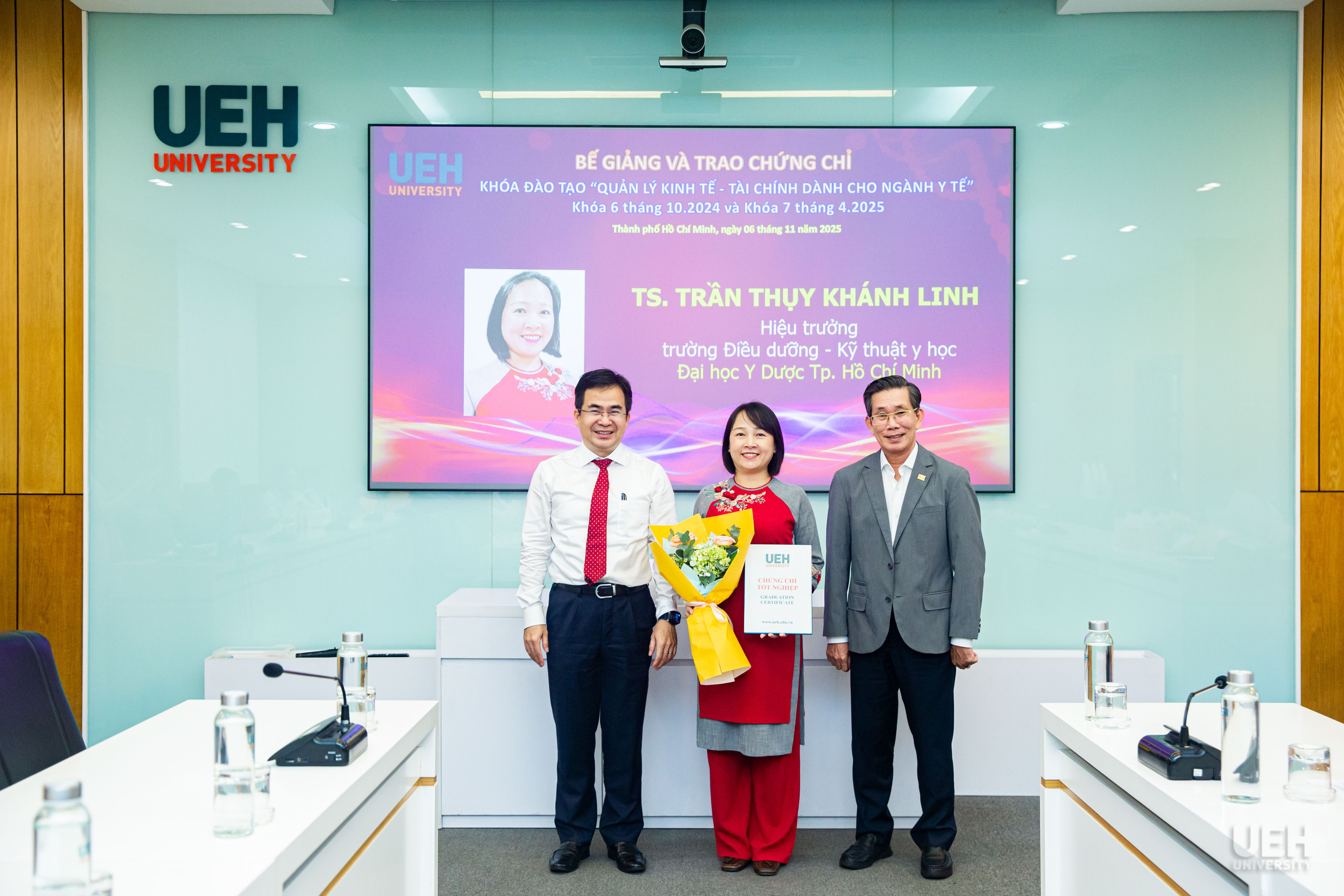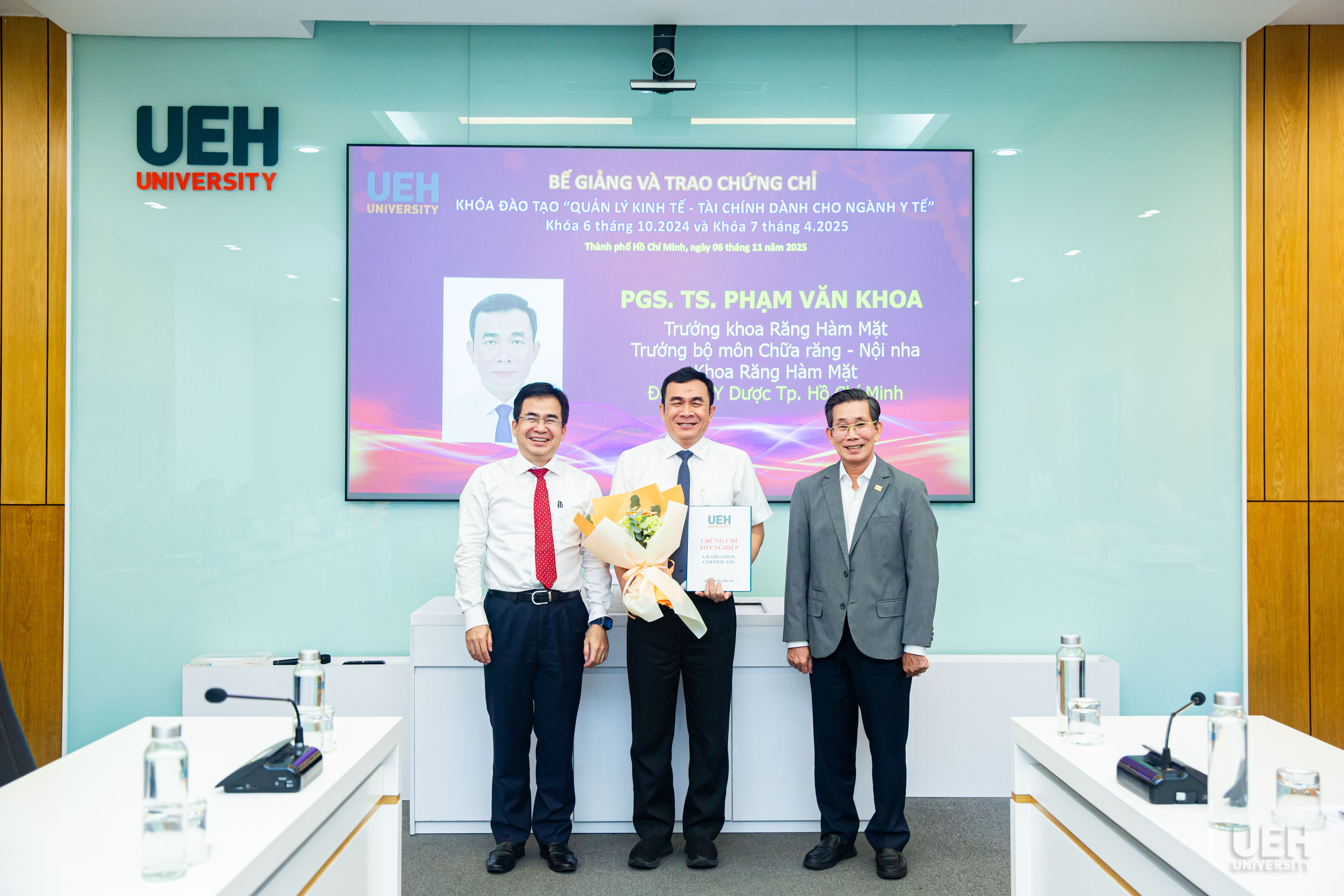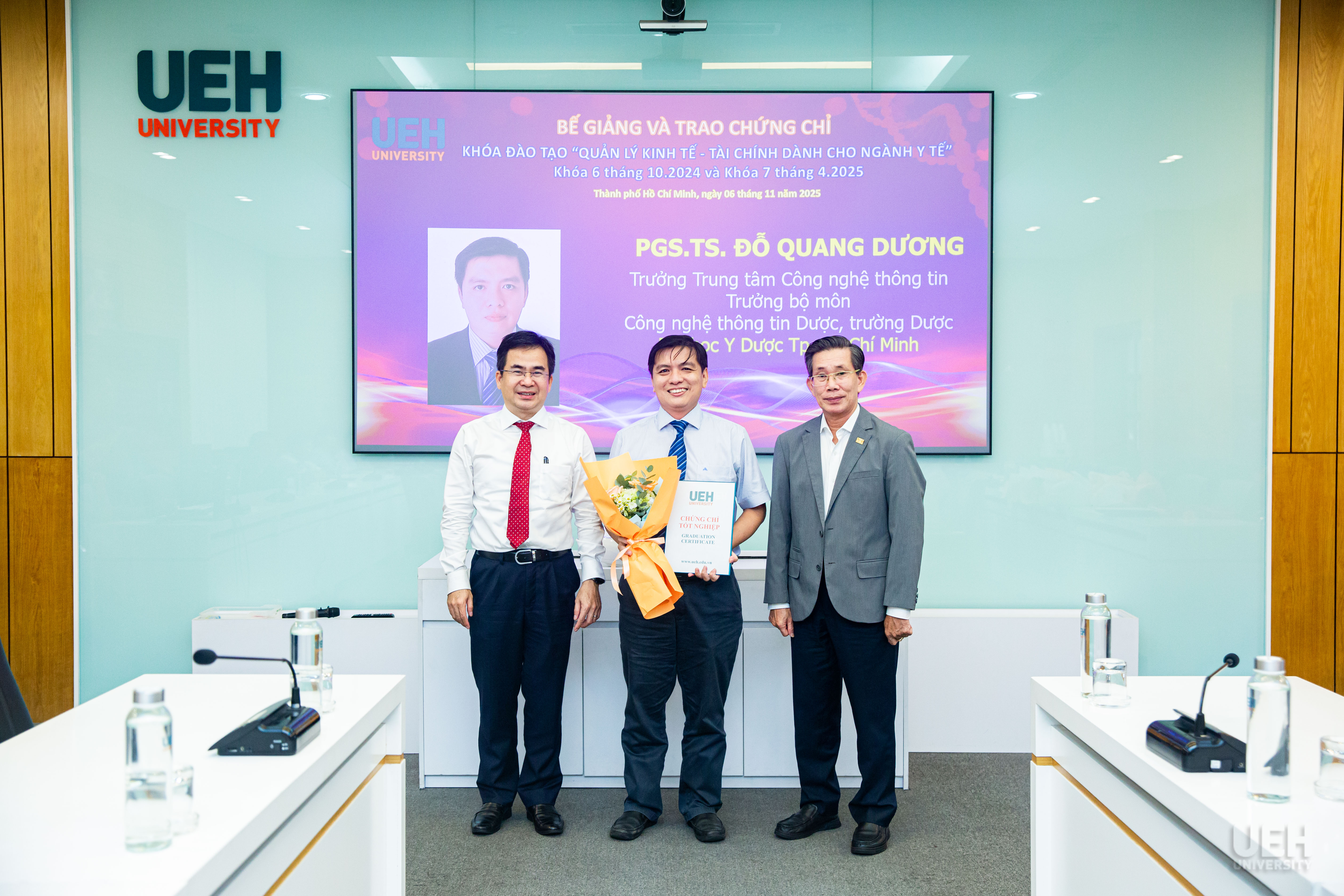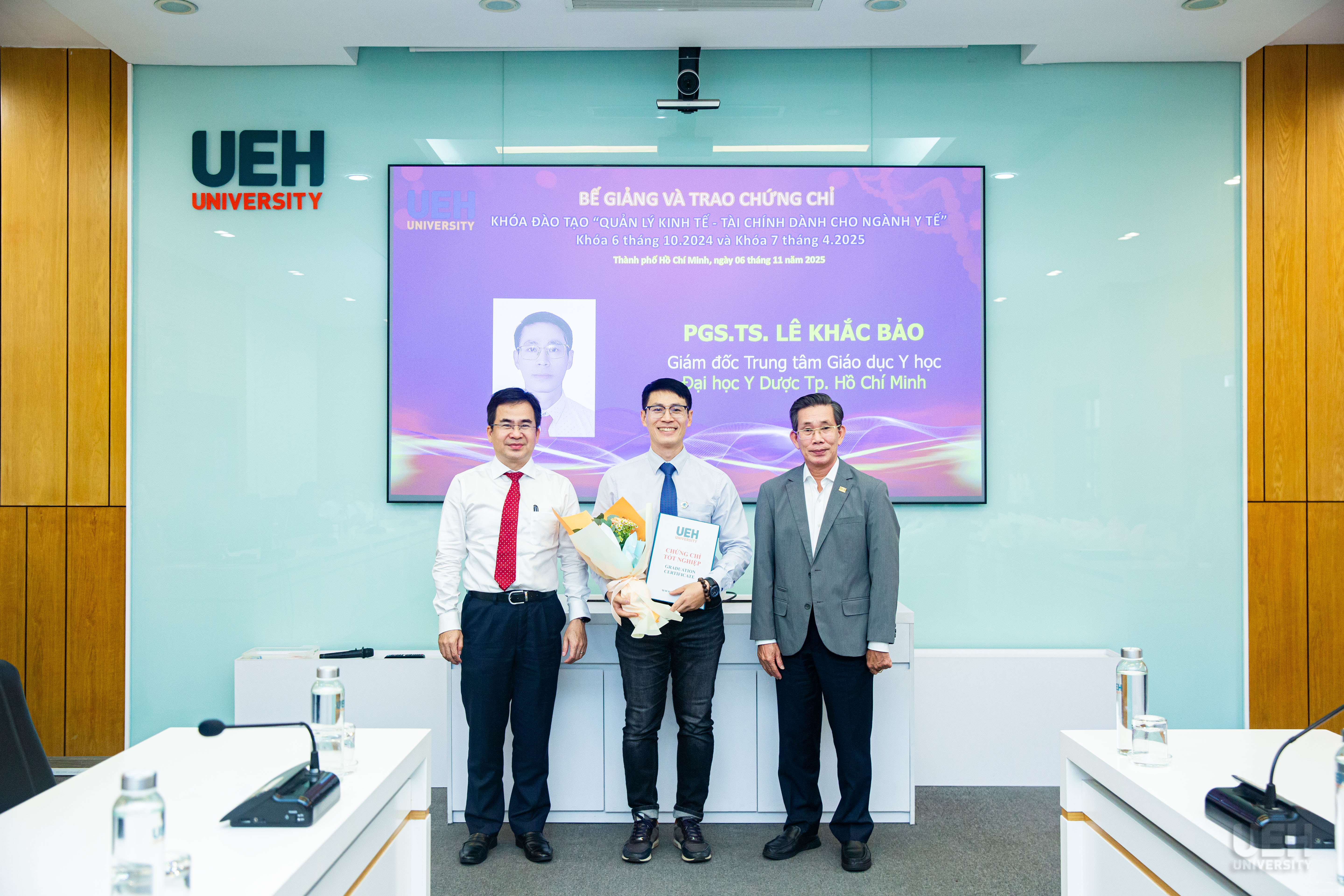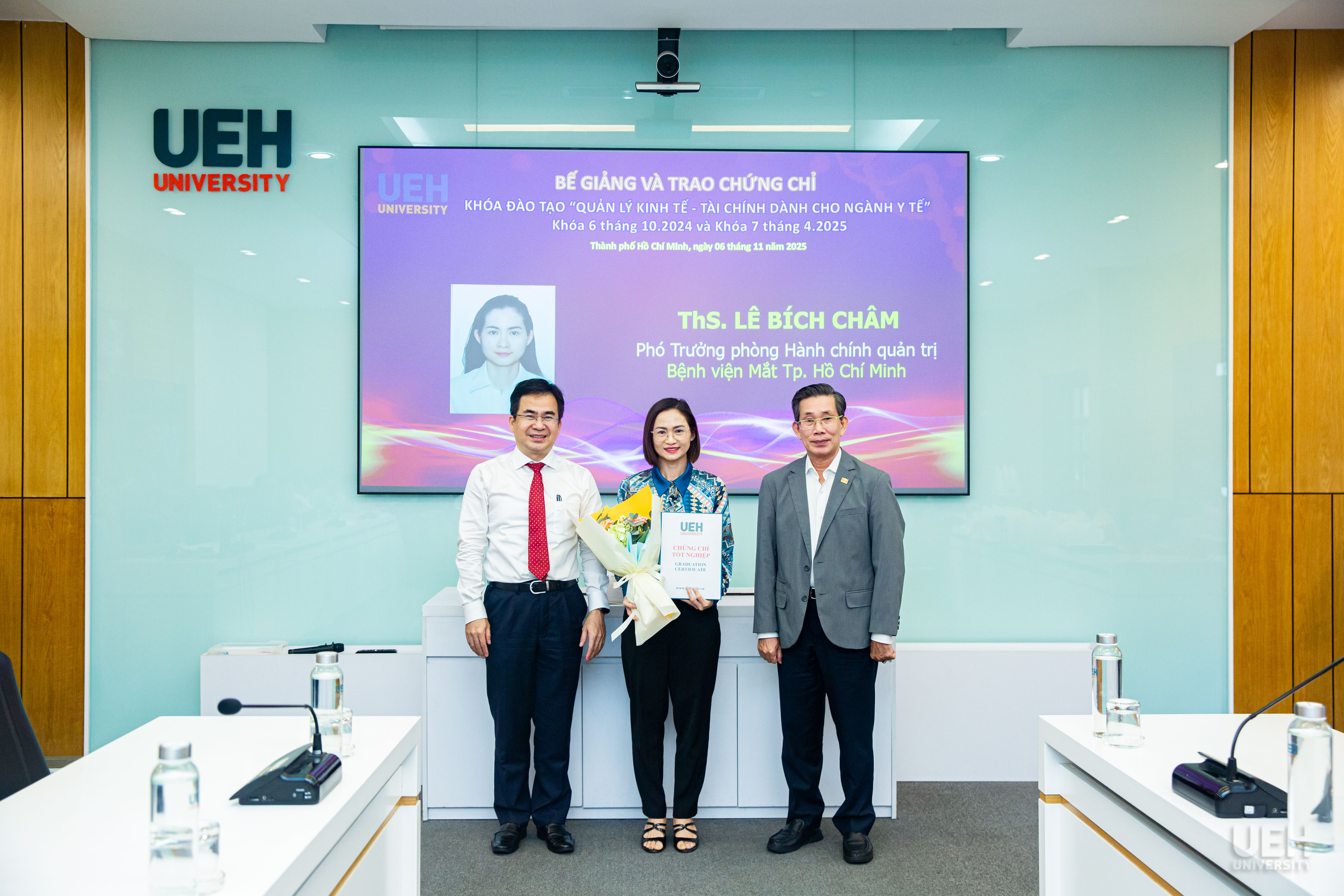 Sáng ngày 06/11/2025, tại phòng A205 – cơ sở 59C Nguyễn Đình Chiểu, Đại học Kinh tế Thành phố Hồ Chí Minh (UEH) đã long trọng tổ chức Lễ Bế giảng và trao chứng chỉ Khóa bồi dưỡng “Quản lý kinh tế - tài chính dành cho ngành Y tế” Khóa 7 - đợt tháng 4/2025.