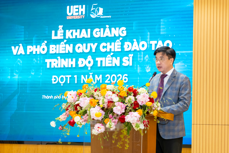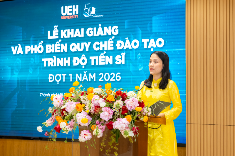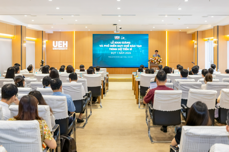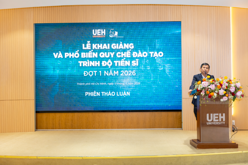 Sáng ngày 11/4/2026, Đại học Kinh tế Thành phố Hồ Chí Minh (UEH) đã tổ chức Lễ khai giảng và phổ biến quy chế đào tạo trình độ Tiến sĩ năm 2026 - đợt 1 tại Hội trường A.103, cơ sở A. Chương trình diễn ra trong không khí trang trọng, đánh dấu cột mốc khởi đầu cho hành trình học thuật chuyên sâu của các tân nghiên cứu sinh tại UEH.