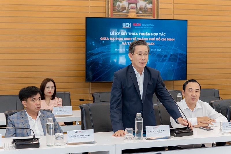 Phát biểu tại buổi lễ, GS.TS. Sử Đình Thành - Giám đốc UEH chia sẻ: “Trong những năm qua, UEH đã không ngừng nỗ lực khẳng định vị thế là một trong những Đại học Đa ngành và Bền vững hàng đầu tại Việt Nam, đạt nhiều thành tựu quốc tế. UEH hiện có 4 trường thành viên: Trường Kinh doanh, Trường Kinh tế, Luật và Quản lý Nhà nước, Trường Công nghệ và Thiết kế, Trường Tài năng và 2 phân hiệu Vĩnh Long và Nexus Nha Trang khởi công xây dựng vào 19.8.2025. Sự phát triển của UEH luôn gắn liền với sự đồng hành của các đối tác chiến lược, trong đó Tập đoàn GELEX là một điển hình tiêu biểu. Với khởi nguồn là doanh nghiệp nhà nước, nay là một trong những tập đoàn đầu tư hàng đầu Việt Nam, hoạt động đa ngành trong nhiều lĩnh vực và sở hữu nhiều thương hiệu nổi tiếng, chúng tôi nhận định GELEX chính là đối tác lý tưởng, mang đến những cơ hội thực tiễn quý giá cho sinh viên. Thông qua thỏa thuận hợp tác, UEH kỳ vọng sinh viên sẽ được tiếp cận môi trường làm việc chuyên nghiệp, tham gia các dự án thực tế, phát triển toàn diện kiến thức và kỹ năng mềm, sẵn sàng hội nhập và thành công trong sự nghiệp. Bên cạnh đó, sự đồng hành trong các dự án nghiên cứu, khởi nghiệp, đổi mới sáng tạo và tài trợ các hoạt động của nhà trường, sinh viên sẽ tạo nên giá trị bền vững, thiết thực cho cả hai bên, đóng góp tích cực vào sự phát triển của doanh nghiệp và xã hội.”