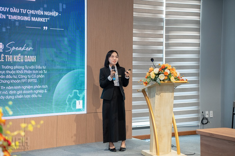 Trong bài chia sẻ số 1 “Các lớp tài sản & tư duy đầu tư chuyên nghiệp – Khi Việt Nam bước vào kỷ nguyên Emerging Market”, chị Lê Thị Kiều Oanh – Trưởng phòng Tư vấn Đầu tư, Khối Phân tích và Tư vấn đầu tư, Công ty Cổ phần Chứng khoán FPT (FPTS) – đã mang đến nhiều phân tích sâu sắc về đặc điểm và vai trò của các lớp tài sản chủ đạo trên thị trường Việt Nam. Diễn giả giúp sinh viên hiểu rõ cách tư duy của nhà đầu tư chuyên nghiệp trong việc cân bằng rủi ro – lợi nhuận – mục tiêu tài chính, đồng thời nhận ra những thay đổi đáng chú ý của dòng vốn khi Việt Nam gia nhập nhóm thị trường Emerging Market.