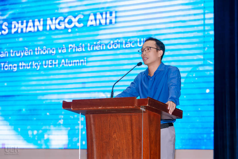 ThS. Phan Ngọc Anh - Phó Trưởng ban Ban Truyền thông và Phát triển đối tác, Tổng thư ký UEH Alumni phát biểu tại buổi lễ