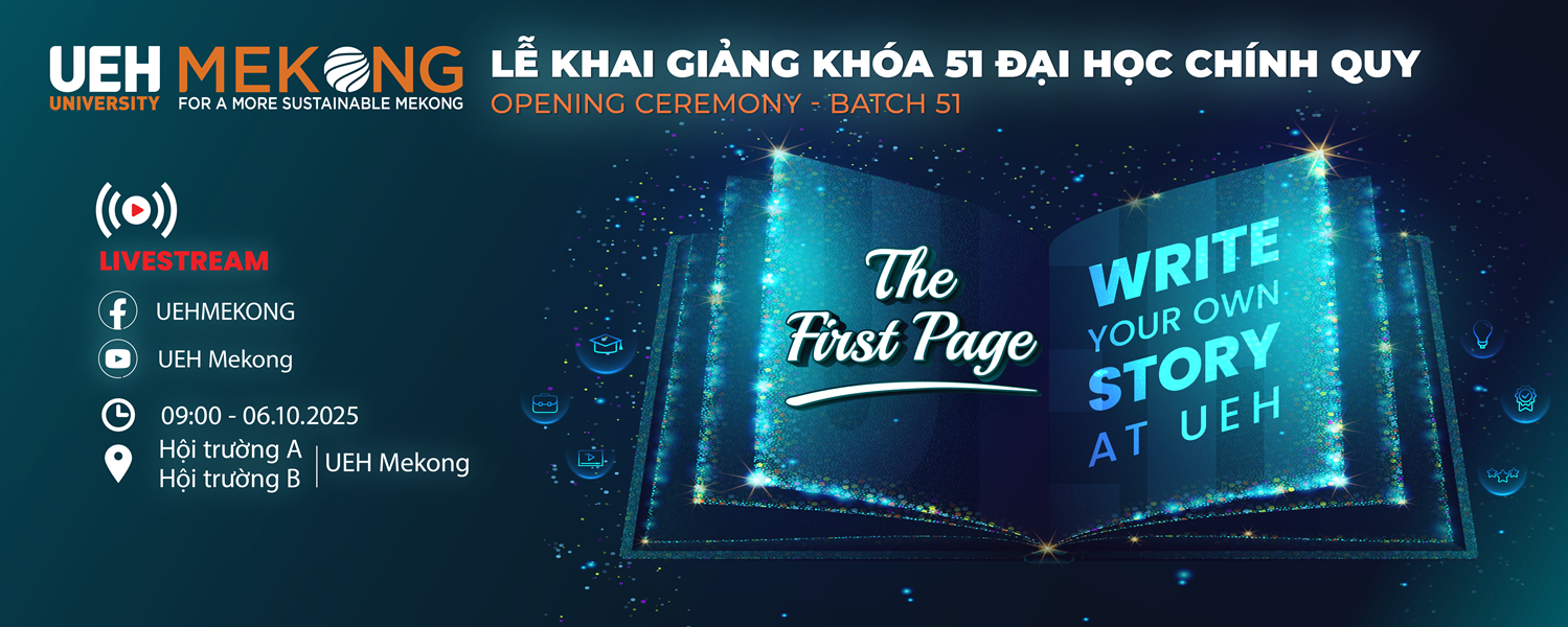 Sáng ngày 06/10/2025, Phân hiệu Đại học Kinh tế Thành phố Hồ Chí Minh - UEH Mekong, long trọng tổ chức Lễ Khai giảng Khóa 51 Đại học chính quy với chủ đề “The First Page - Write Your Own Story at UEH”, chính thức chào đón hơn 600 tân sinh viên Khóa 51 Đại học chính quy tại Hội trường A, Hội trường B (1B Nguyễn Trung Trực, phường Tân Hạnh, tỉnh Vĩnh Long) và trực tuyến trên các kênh truyền thông chính thức của UEH Mekong.