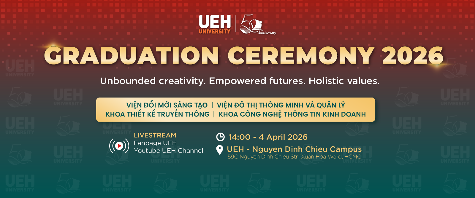Chiều ngày 04/04/2026, Đại học Kinh tế Thành phố Hồ Chí Minh (UEH) long trọng tổ chức Lễ tốt nghiệp dành cho các Tân cử nhân Viện Đổi mới sáng tạo, Viện Đô thị thông minh và Quản lý, Khoa Thiết kế truyền thông và Khoa Công nghệ thông tin kinh doanh tại Hội trường A.116, cơ sở A UEH.