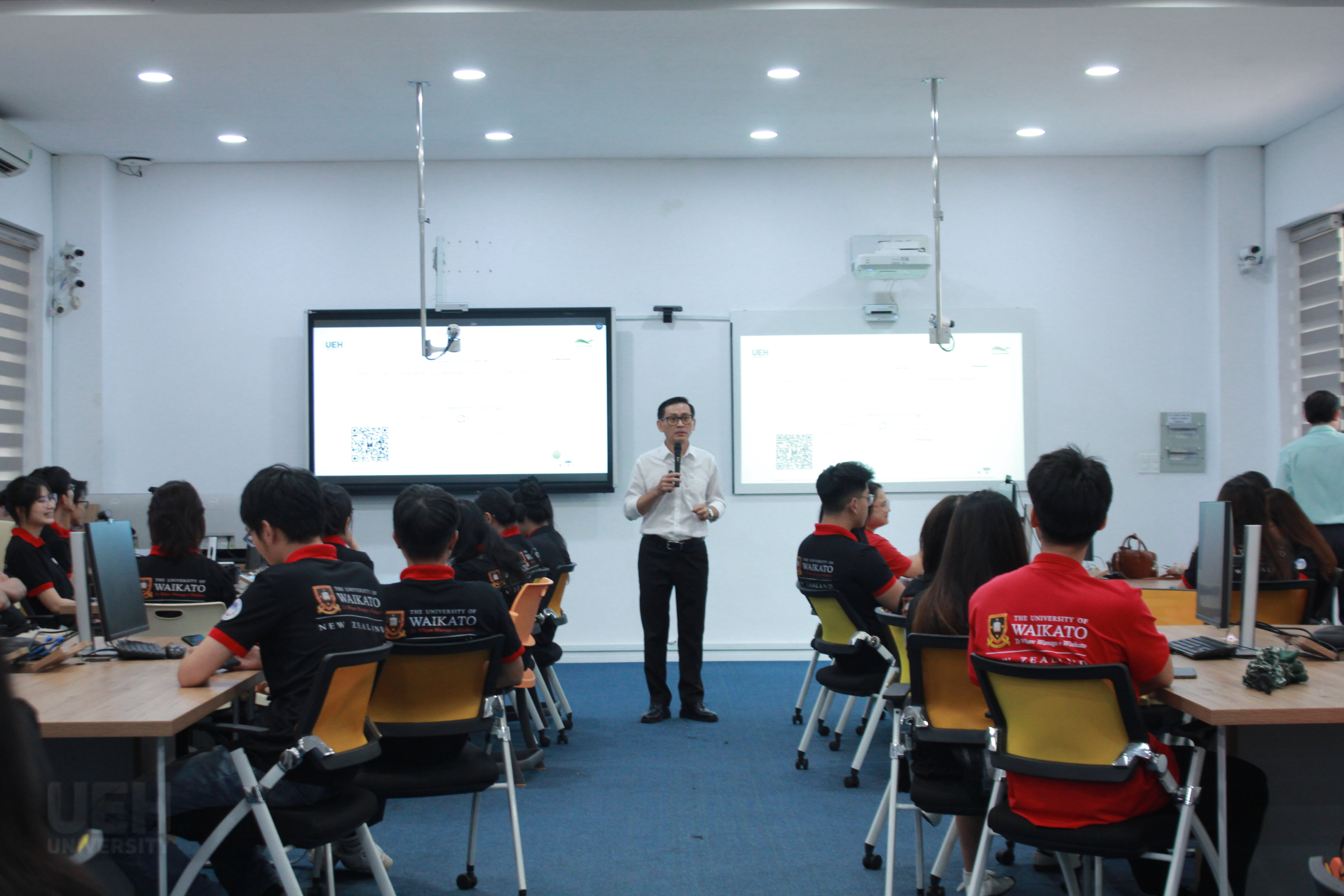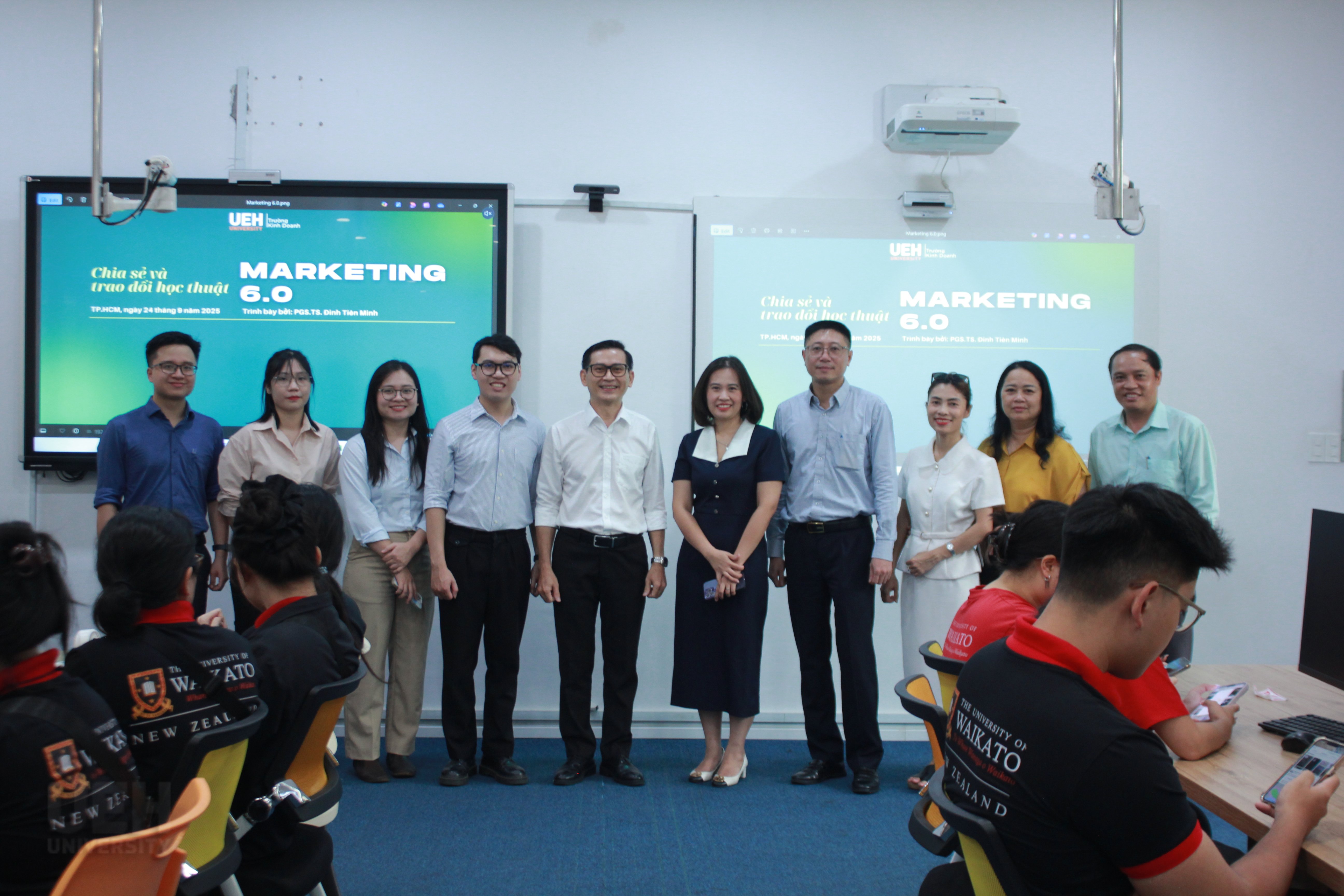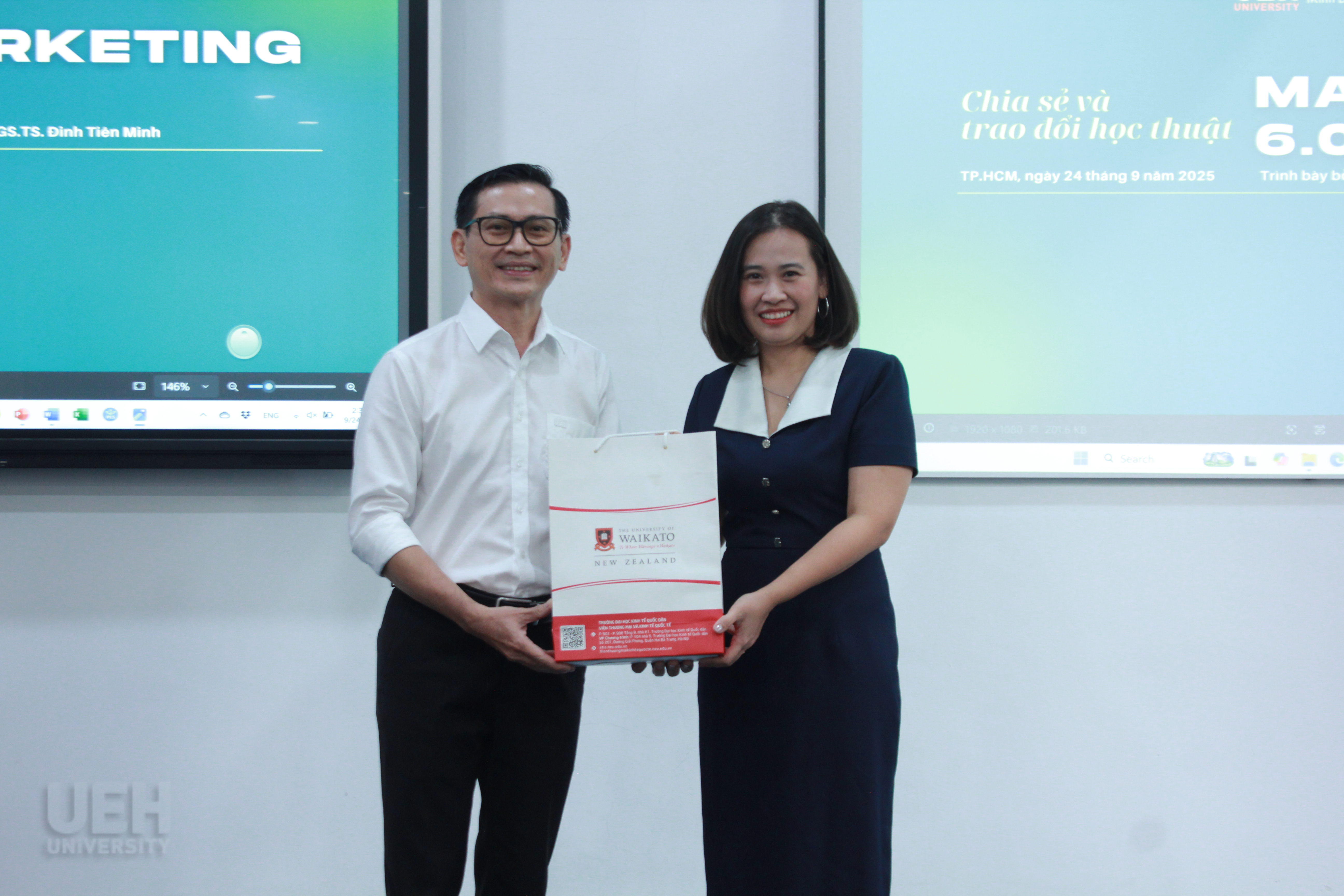Ngày 24/9/2025, sinh viên từ chương trình liên kết giữa Đại học Waikato (New Zealand) và Đại học Kinh tế Quốc dân cùng sinh viên Đại học Kinh tế Thành phố Hồ Chí Minh (UEH) đã tham gia buổi chia sẻ và trao đổi học thuật với chủ đề Marketing 6.0. Buổi chia sẻ được thiết kế như một cầu nối giữa lý thuyết và thực tiễn, giúp sinh viên không chỉ nắm bắt xu hướng mới mà còn trực tiếp trải nghiệm, qua đó có được góc nhìn sâu sắc về ứng dụng kiến thức vào thực tiễn.