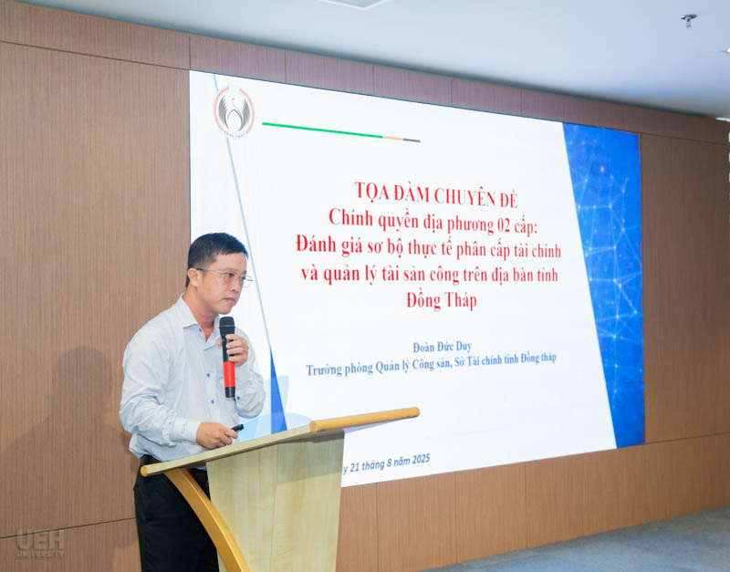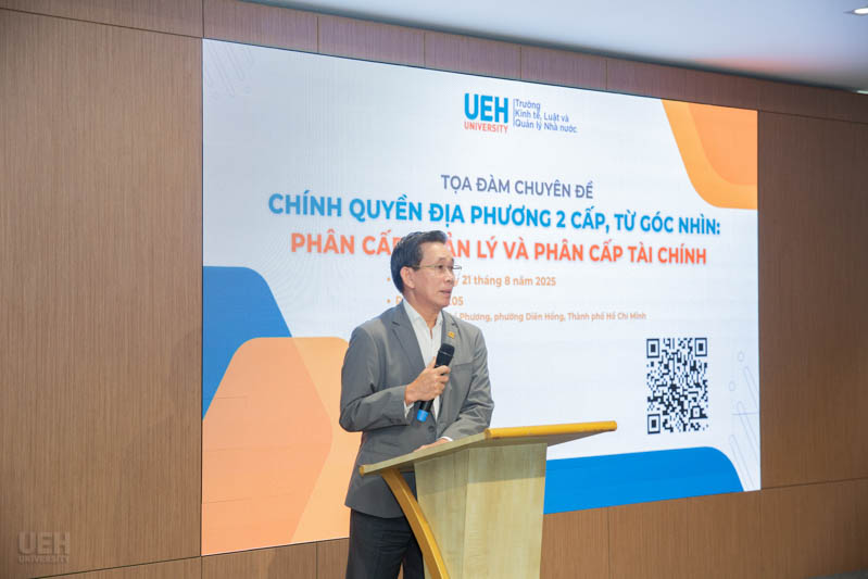 Sáng ngày 21/8/2025, tại phòng B1.205, Cơ sở 279 Nguyễn Tri Phương, Trường Kinh tế, Luật và Quản lý nhà nước UEH (CELG) đã tổ chức tọa đàm chuyên đề “Chính quyền địa phương 2 cấp: dưới góc nhìn phân cấp quản lý và phân cấp tài chính”. Tọa đàm vinh dự đón tiếp sự tham dự của các đại biểu đến từ nhiều cơ quan, tổ chức và địa phương, khách mời đến từ những đơn vị đào tạo cùng sự hiện diện của giảng viên, học viên, sinh viên của trường CELG.