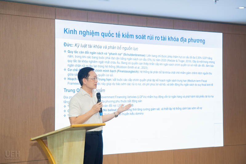Trong khuôn khổ buổi tọa đàm, phần trình bày của PGS.TS. Nguyễn Hồng Thắng – Giảng viên Khoa Tài chính công, Trường CELG UEH đã làm sáng tỏ những loại rủi ro tài khóa và đặc điểm, tác động của các rủi ro tài khóa trong quá trình tái cơ cấu chính quyền địa phương ở Việt Nam, cũng như phân tích kinh nghiệm quốc tế và đưa ra các thảo luận chính sách nhằm kiểm soát rủi ro và định hướng phát triển trong tương lai.