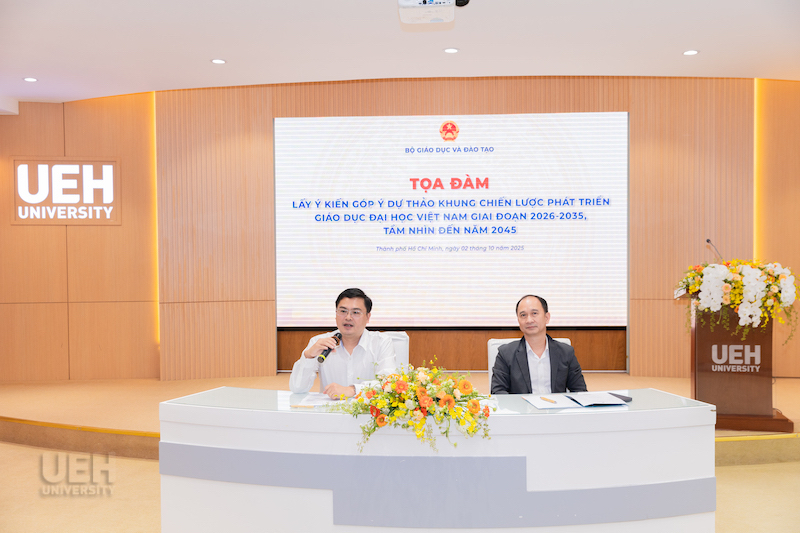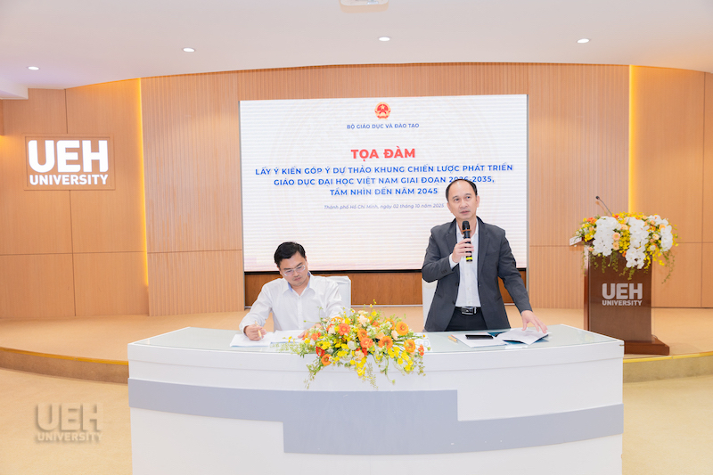Chiều ngày 02/10/2025, tại Hội trường A.103, Đại học Kinh tế Thành phố Hồ Chí Minh (UEH), Bộ Giáo dục và Đào tạo (Bộ GD&ĐT) đã tổ chức tọa đàm lấy ý kiến góp ý dự thảo Khung chiến lược phát triển Giáo dục đại học Việt Nam giai đoạn 2026-2035, tầm nhìn đến năm 2045. Đây là sự kiện quan trọng trong tiến trình xây dựng định hướng chiến lược phát triển giáo dục đại học trong 10 năm tới, đồng thời đặt nền tảng cho tầm nhìn dài hạn đến năm 2045.
