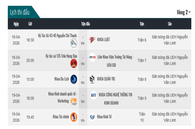 Ngày 11-12/4/2026, vòng 1 bóng đá Nam Trường Tươi Group - UEH League 2026 khởi tranh bùng nổ với 34 bàn thắng sau 5 trận. Phần lớn các trận đấu diễn ra với thế trận cởi mở, xuất hiện 4 chiến thắng, 1 trận hòa cùng nhiều màn trình diễn nổi bật, trong đó trận KTX 43-45 Nguyễn Chí Thanh vs Khoa Du lịch ghi nhận tới 9 bàn thắng.