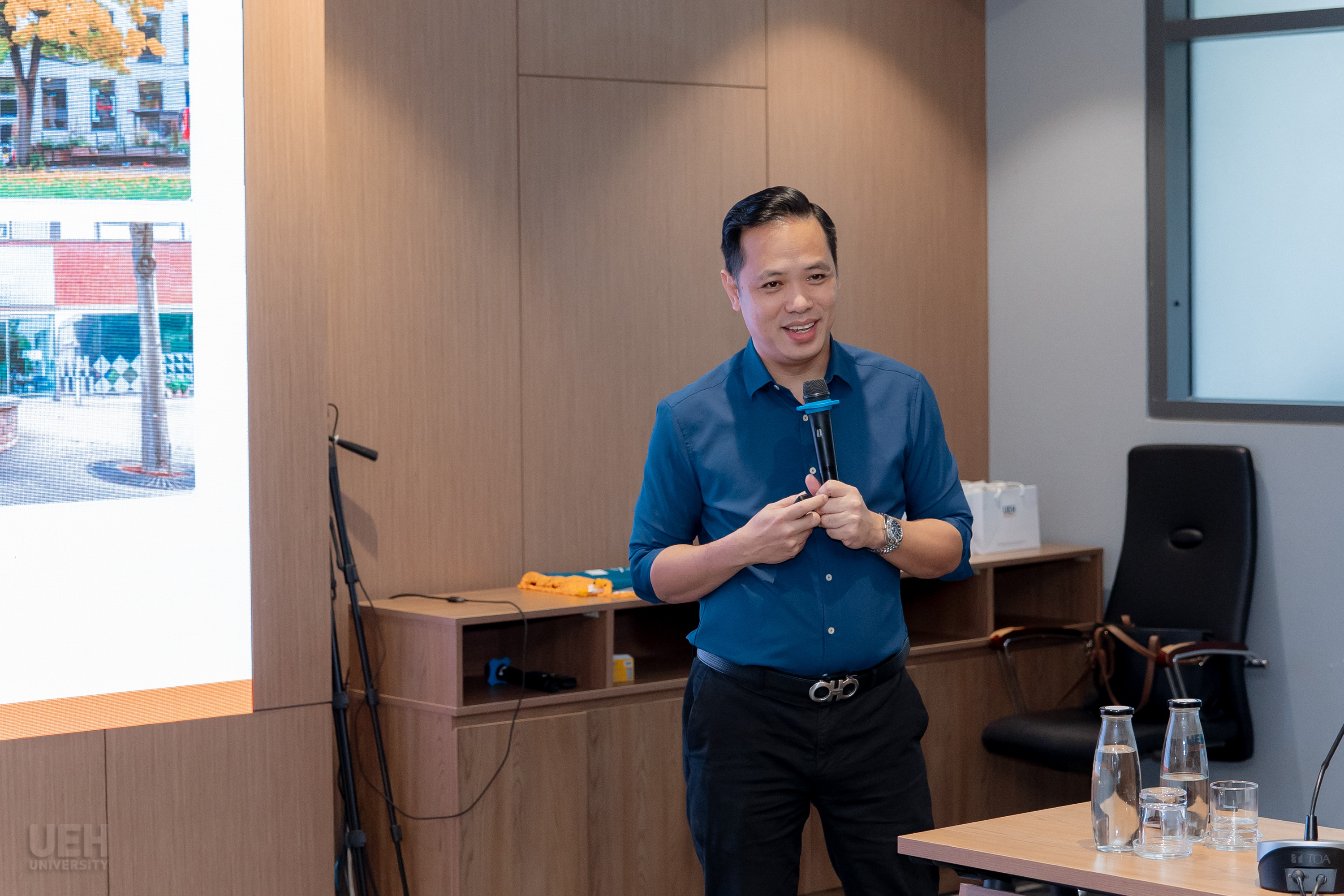 Sau phần phát biểu của đại diện 2 bên, TS. Lê Thị Hạnh An đã giới thiệu tổng quan về UEH, UEH Sustainability Model và định hướng tích hợp công nghệ vào chương trình đào tạo.