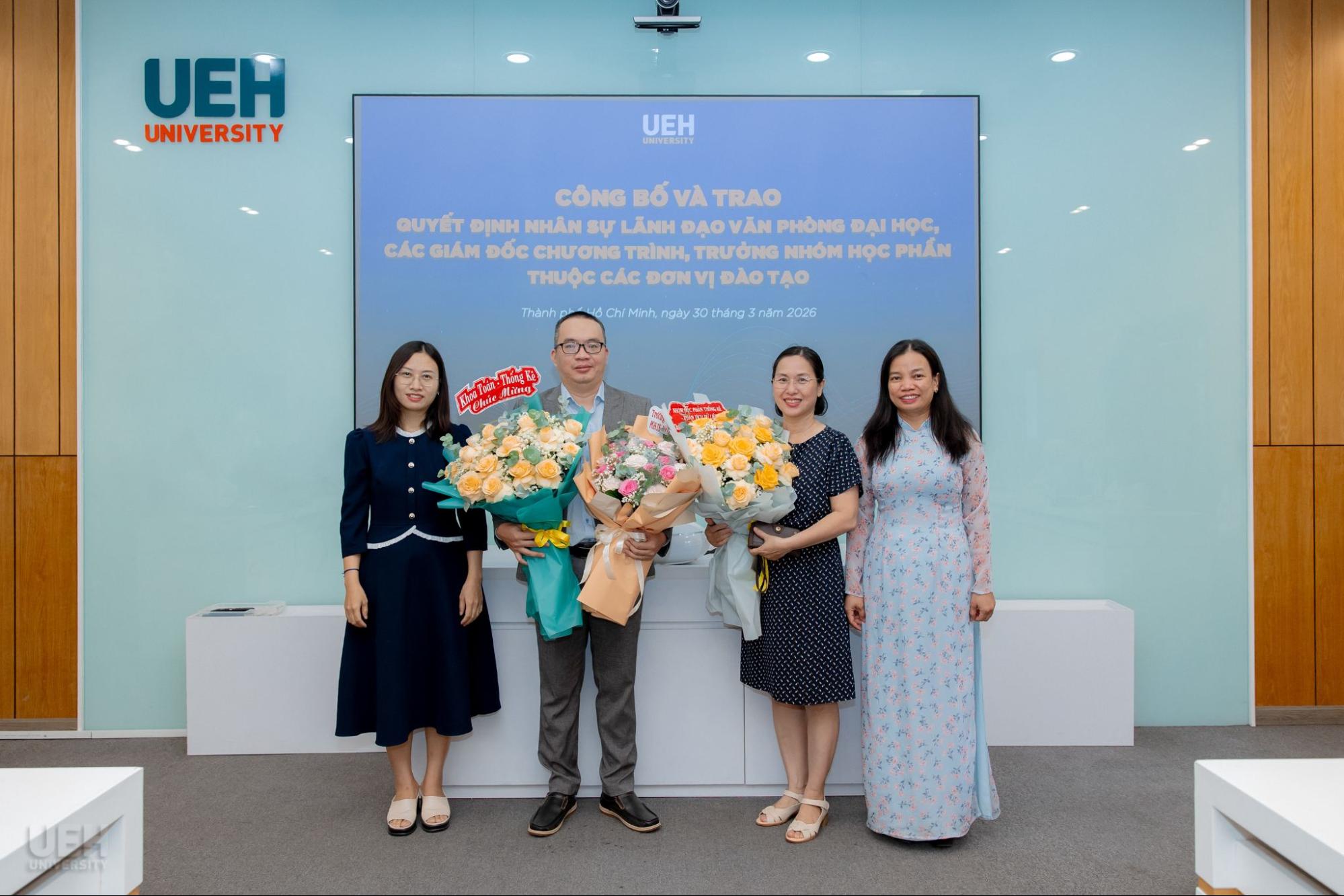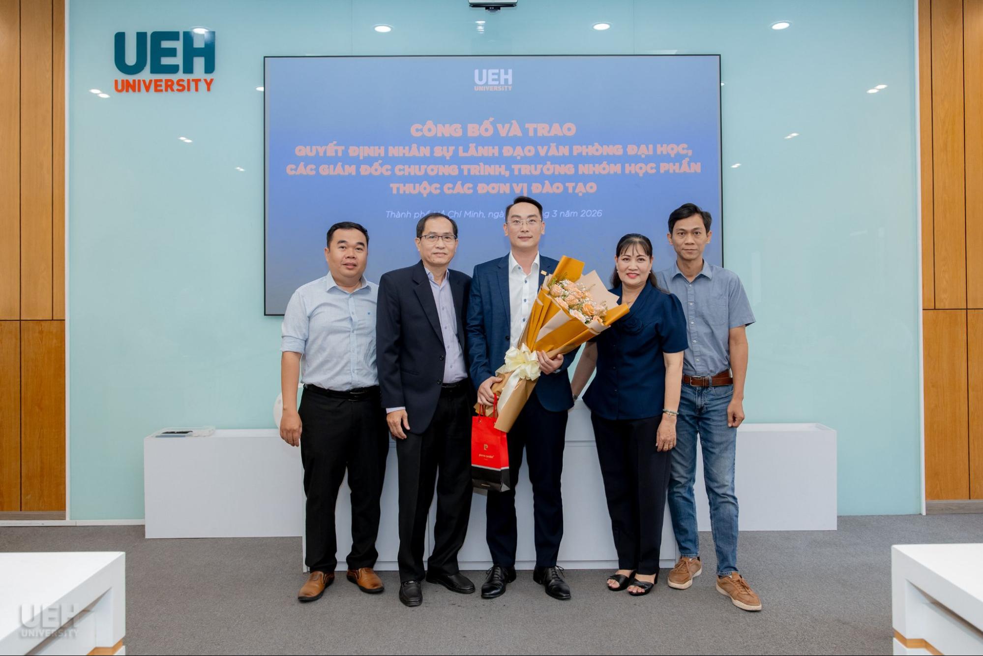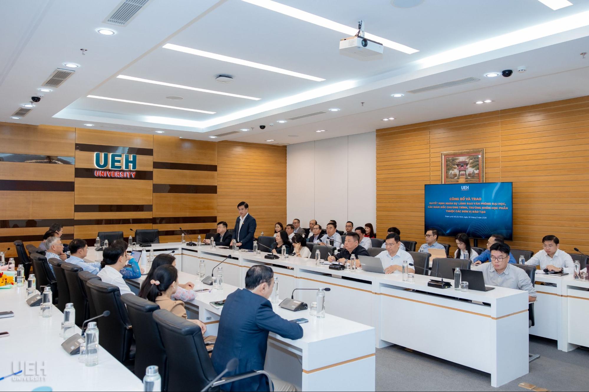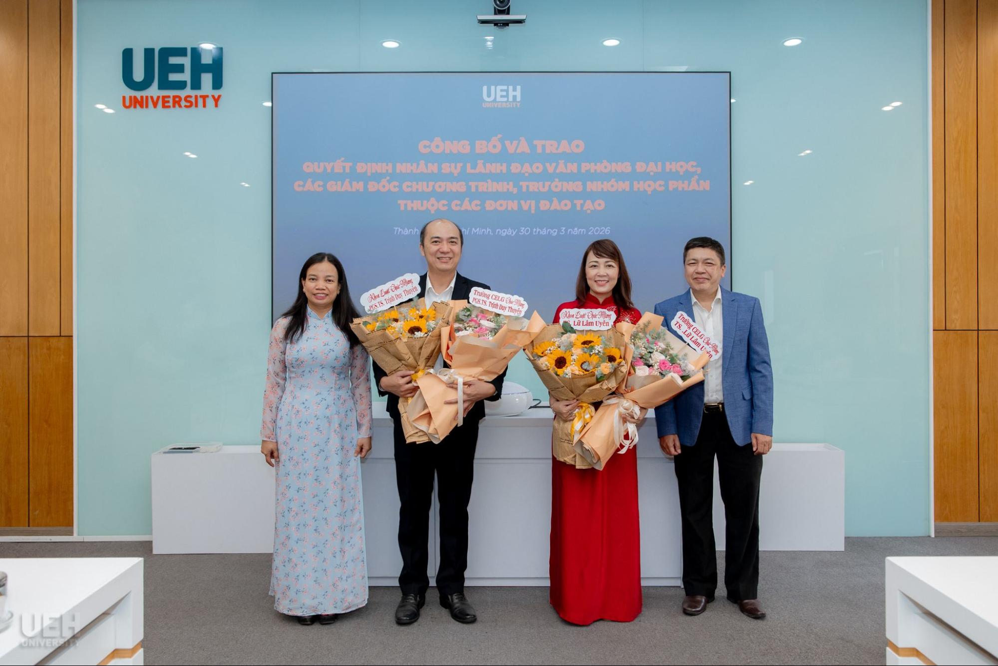 Ngày 30/03/2026, Đại học Kinh tế Thành phố Hồ Chí Minh (UEH) đã tổ chức công bố và trao các quyết định bổ nhiệm nhân sự, góp phần kiện toàn đội ngũ quản lý và chuyên môn, đáp ứng yêu cầu vận hành và phát triển trong giai đoạn mới.