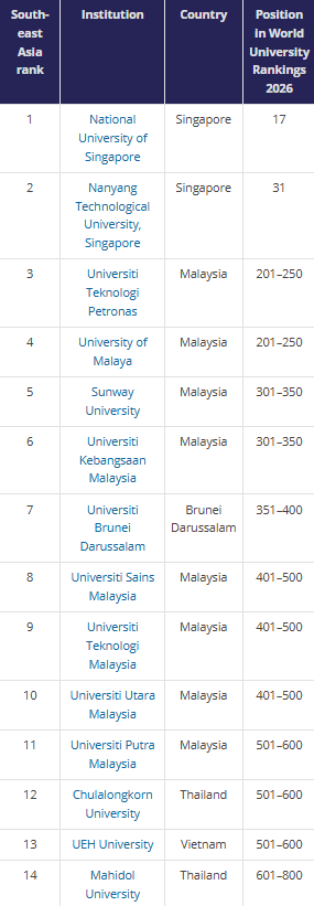 Bảng xếp hạng thí điểm dành cho khu vực Đông Nam Á (THE)Bảng xếp hạng đại học Đông Nam Á được xây dựng dựa trên dữ liệu của Times Higher Education World University Rankings, nhưng tập trung riêng vào các quốc gia thuộc Hiệp hội các quốc gia Đông Nam Á (ASEAN). Đây được xem là bảng xếp hạng thí điểm nhằm cung cấp góc nhìn chi tiết hơn về sự phát triển của giáo dục đại học trong khu vực - một trong những khu vực năng động và tăng trưởng nhanh nhất thế giới. Các trường đại học được đánh giá dựa trên 18 chỉ số thuộc 5 nhóm tiêu chí cốt lõi, gồm: