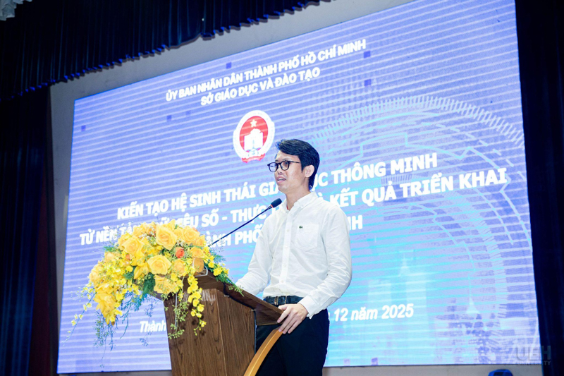 Ông Nguyễn Hà Nguyên - Phó Chánh Văn phòng Sở GD&ĐT TP. Hồ Chí Minh chia sẻ tham luận về "Kinh nghiệm triển khai chuyển đổi số tại địa phương: Thực trạng, khó khăn và giải pháp"