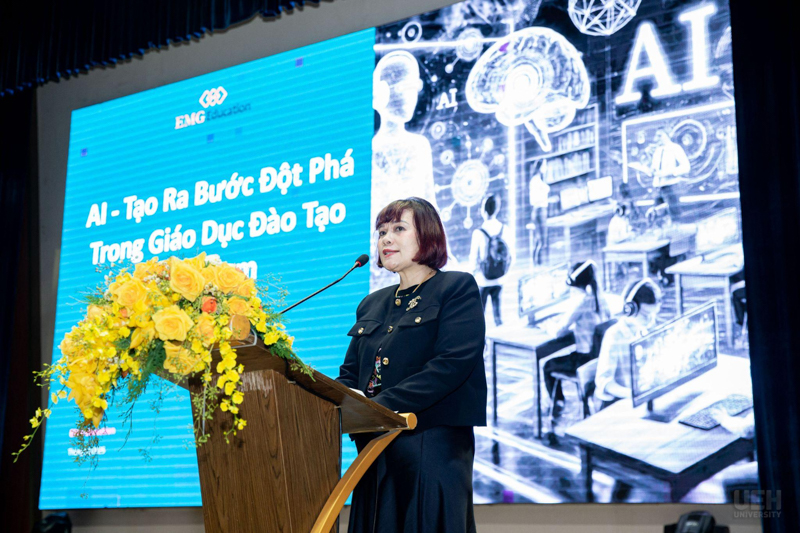 Bà Nguyễn Phương Lan - Tổng Giám đốc Công ty CP Quản lý Giáo dục và Đầu tư EMG trình bày tham luận "Giải pháp ứng dụng công nghệ trong dạy, học, kiểm tra đánh giá"