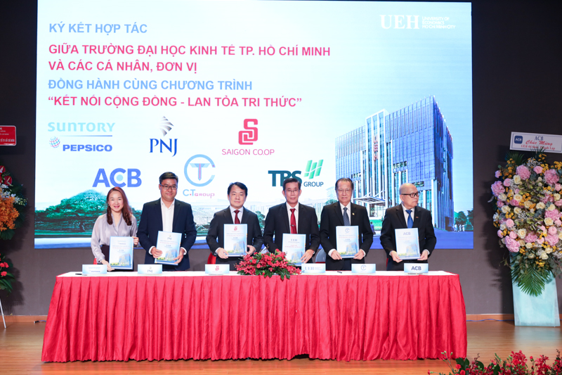 Ngoài ra, UEH cũng tiến hành ký cam kết tham gia đồng hành cùng chương trình “Kết nối cộng đồng - Lan tỏa tri thức” với 11 đơn vị, cá nhân đến từ nhiều lĩnh vực hoạt động khác nhau như nhóm bán lẻ, nhóm ngân hàng, nhóm doanh nghiệp sản xuất và cộng đồng Cựu sinh viên UEH: Cục Phát triển thị trường và doanh nghiệp khoa học và công nghệ (NATEC) thuộc Bộ Khoa học và Công nghệ Việt Nam, Công ty Suntory PepsiCo Việt Nam, Công ty Cổ phần Vàng bạc Đá quý Phú Nhuận (PNJ), Liên hiệp HTX Thương mại TP.HCM (Saigon Co.op), Tập đoàn C.T Group, Ngân hàng TMCP Á Châu (ACB), Ngân hàng TMCP Phương Đông (OCB), Công ty Cổ phần Chăn Nuôi C.P. Việt Nam, Công ty Cổ phần Giải Pháp Thiết Bị Sao Mai, Công ty Cổ phần phát hành sách TP.HCM (Fahasa), Ông Nguyễn Hồ Nam - Cựu sinh viên UEH (Công ty Cổ phần Bamboo Capital)....