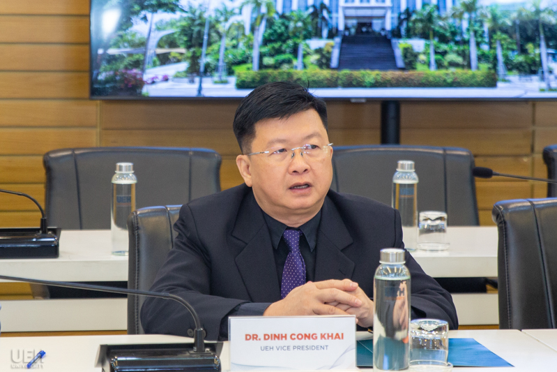 Phát biểu tại cuộc họp, TS. Đinh Công Khải đã chia sẻ về tầm nhìn của UEH trong việc trở thành một đại học đa ngành, có năng lực nghiên cứu và đào tạo ngang tầm khu vực. Trọng tâm của chiến lược này là sự kết hợp giữa khoa học, công nghệ, thiết kế, chính sách công. UEH đang tích cực đẩy mạnh chuyển đổi số, vận hành mô hình đổi mới sáng tạo và tiên phong đào tạo các chuyên ngành mới nhằm đáp ứng nhu cầu nhân lực chất lượng cao. Song song đó, UEH tiếp tục phát triển các chương trình đào tạo bằng tiếng Anh, đồng thời triển khai các mô hình liên kết 2+2, 3+1 với các đối tác quốc tế, góp phần tăng cường cơ hội học tập và trao đổi cho sinh viên.