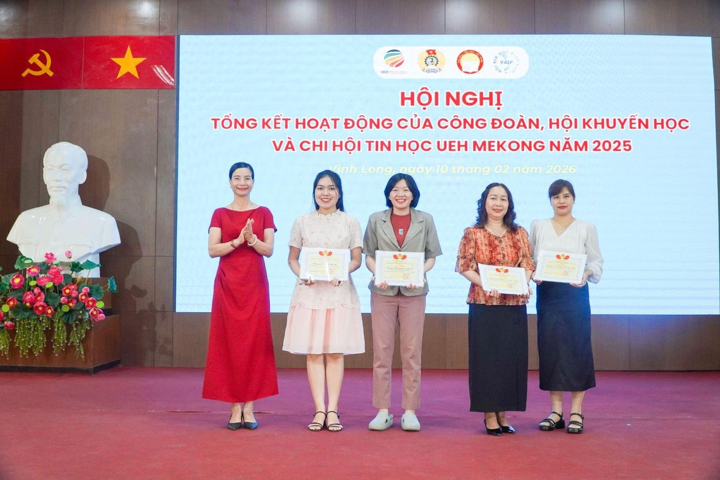 TS. Nguyễn Thị Thý Liễu - Bí thư Đảng ủy bộ phận, Giám đốc Phân hiệu trao Giấy khen của Ban Chấp hành Công đoàn cho các tập thể đạt thành tích Xuất sắc tiêu biểu trong hoạt động Công đoàn cơ cở UEH Mekong năm 2025