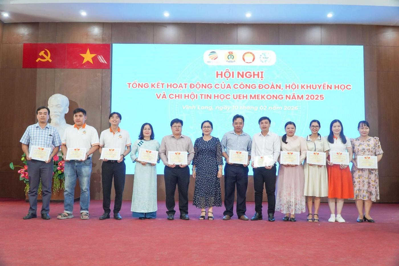 ThS. Hồ Thiện Quyền - Chủ tịch Công đoàn cơ sở trao Giấy khen của Ban Chấp hành Công đoàn cho các cá nhân đạt thành tích Xuất sắc tiêu biểu trong hoạt động Công đoàn cơ sở UEH Mekong năm 2025