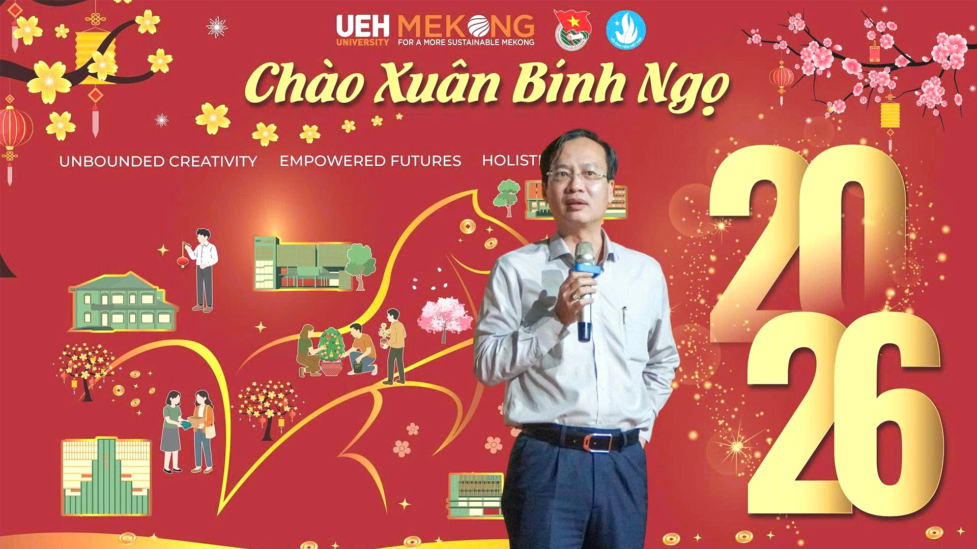 Xuân Bính Ngọ 2026 đang đến gần, mang theo kỳ vọng về một chặng đường mới. Khi mùa Xuân thực sự gõ cửa và nhịp làm việc trở lại sau những ngày Tết cổ truyền, UEH Mekong sẽ tiếp tục chuyển hóa những chuẩn bị hôm nay thành hành động cụ thể của ngày mai. Trong khoảnh khắc giao mùa đầy ý nghĩa này, UEH Mekong trân trọng gửi đến Quý Lãnh đạo, Quý Thầy, Cô, viên chức, người lao động, sinh viên, đối tác và toàn thể cộng đồng lời chúc năm mới an lành, hạnh phúc và tràn đầy yêu thương; chúc mỗi gia đình đón Tết sum vầy, ấm áp, mỗi cá nhân thêm vững tin trên hành trình phía trước và mỗi tập thể thêm gắn kết, để sắc Xuân không chỉ hiện diện trong khoảnh khắc giao mùa mà còn lan tỏa trong từng nỗ lực, từng khát vọng và những thành quả tốt đẹp của năm mới.