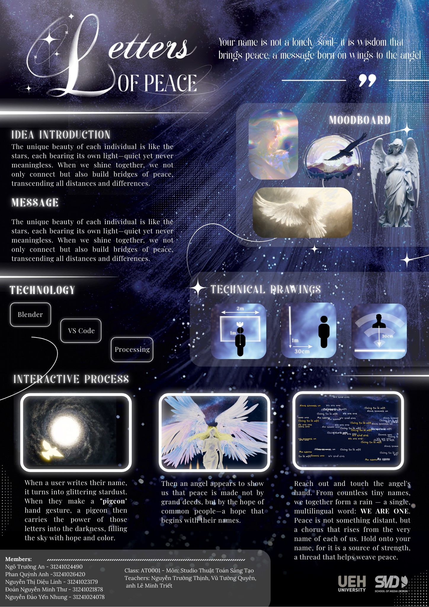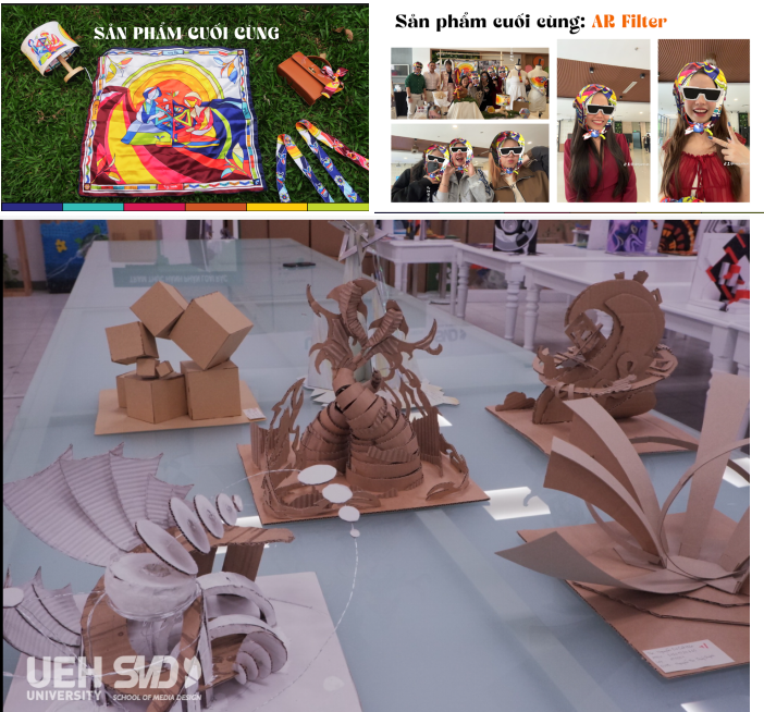 Dòng chảy công nghệ - nghệ thuật tại UEH được khởi nguồn từ chính không gian học thuật, nơi nghệ thuật được tiếp cận như một phương pháp học tập và tư duy giúp người học quan sát, phản biện và kết nối với đời sống đương đại. Trong các không gian trưng bày học phần/dự án, sinh viên không chỉ giới thiệu tác phẩm hoàn thiện mà còn trình bày toàn bộ hành trình sáng tạo, từ quan sát, phân tích lớp nghĩa văn hóa đến chuyển hóa trải nghiệm cá nhân thành hình thức nghệ thuật.