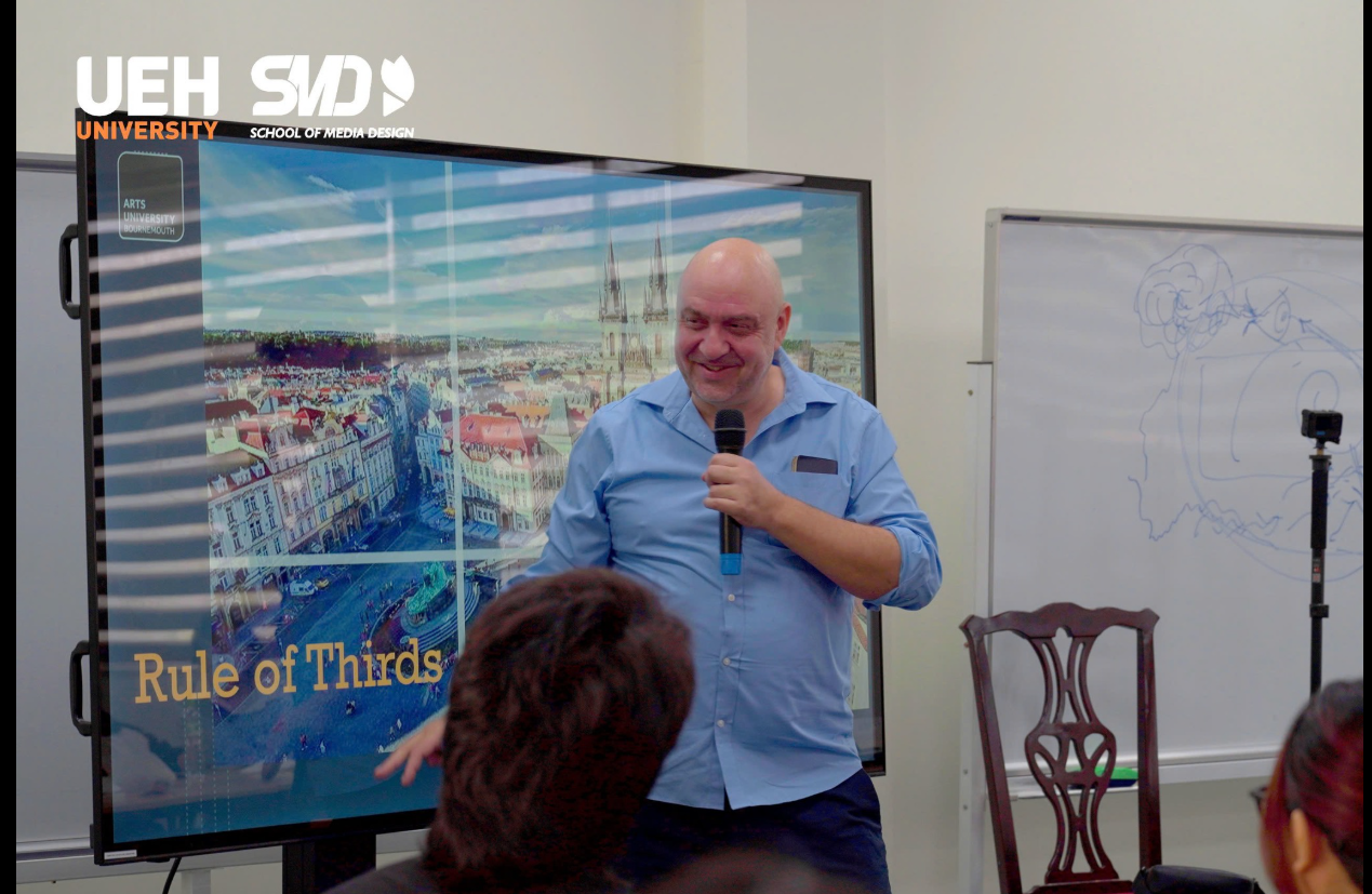 Từ nền tảng đó, chuỗi workshop chuyên đề được triển khai, đóng vai trò “cầu nối” giữa lý thuyết và thực hành. Workshop “Composition and Space” cùng Giáo sư Xavier Pick (Arts University Bournemouth) giúp sinh viên phát triển tư duy thị giác và ngôn ngữ hình ảnh. Workshop “Introduction and Hands-on Experience with AI Art” mở rộng tiếp cận nghệ thuật trí tuệ nhân tạo theo hướng tỉnh thức và có trách nhiệm, xem AI là công cụ hỗ trợ sáng tạo, song hành cùng cảm xúc, đạo đức và tư duy con người.
