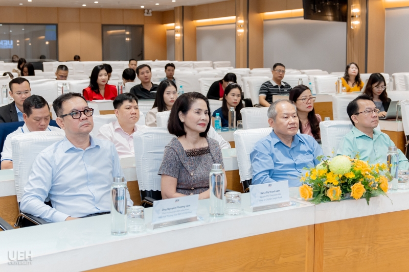 GS.TS. Nguyễn Đông Phong - Chủ tịch Hội đồng UEH nhiệm kỳ 2020-2025, Trưởng ban Chỉ đạo - Cố vấn; GS.TS. Sử Đình Thành - Giám đốc UEH, Thành viên ban Chỉ đạo - Cố vấn; TS. Đinh Công Khải - Phó Giám đốc UEH, Thành viên ban Chỉ đạo - Cố vấn, Trưởng ban Điều hành cùng tham gia trao đổi, chia sẻ và lắng nghe ý kiến từ các đơn vị báo chí, doanh nghiệp và khách mời