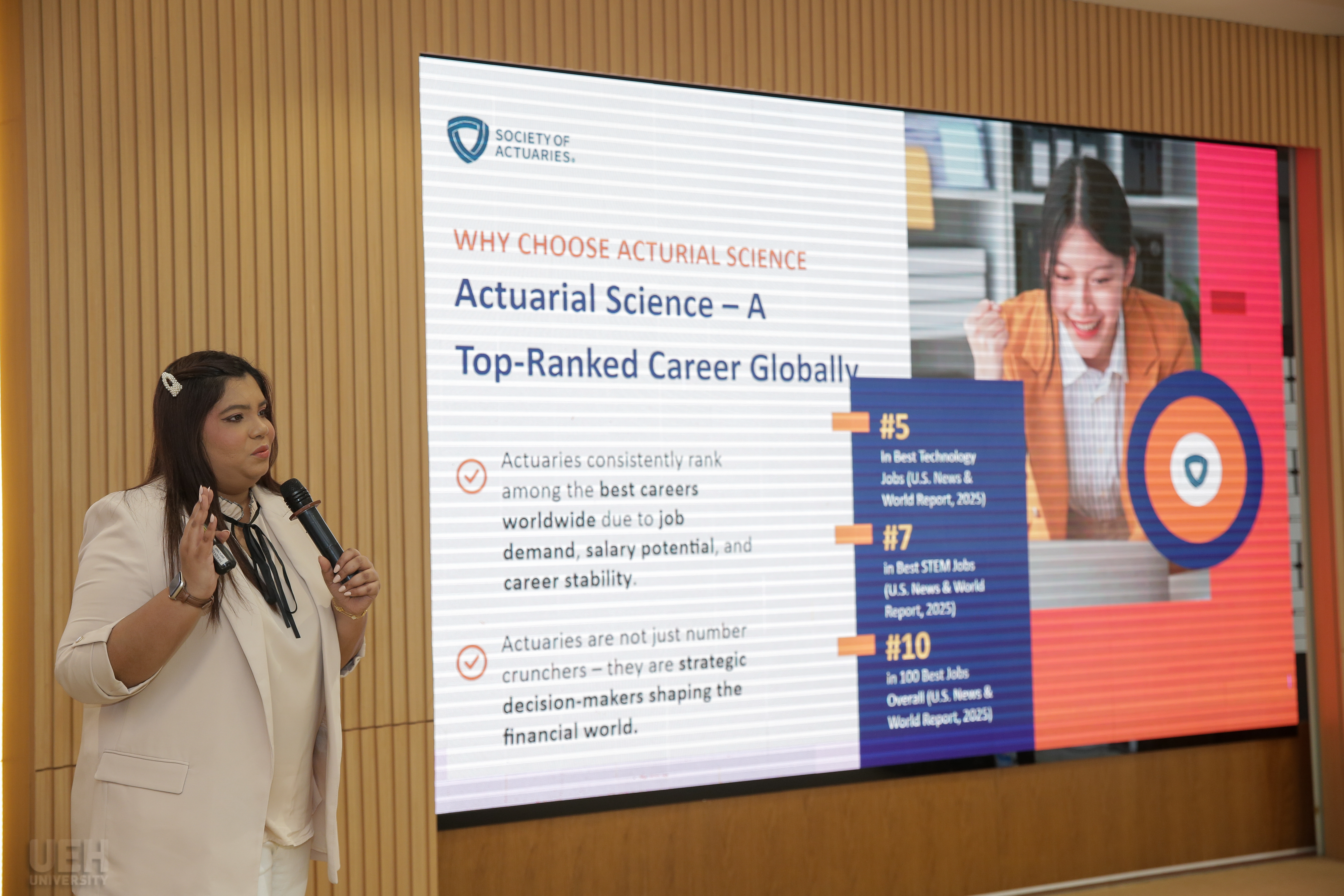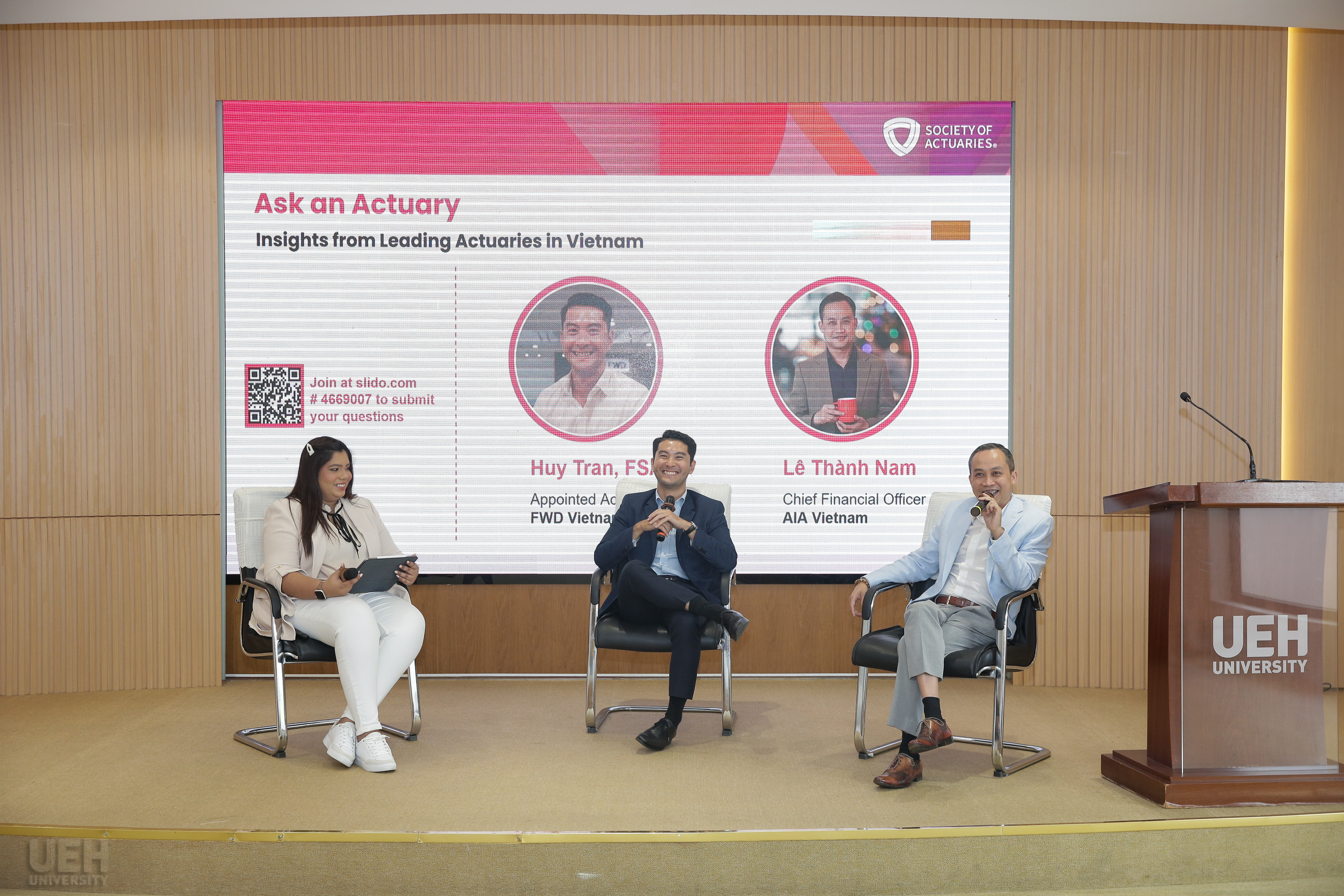 - Talk show “Ask an Actuary: Insights from Leading Actuaries in Vietnam”: Tại đây, sinh viên được tìm hiểu lộ trình SOA (ASA, FSA), cơ hội học bổng, tài nguyên học tập và trực tiếp đặt câu hỏi cho chuyên gia. Ngoài ra, các khách mời từ AIA và FWD đã chia sẻ kinh nghiệm, cơ hội nghề nghiệp, cũng như tác động của dữ liệu và trí tuệ nhân tạo đến vai trò actuarial trong ngành bảo hiểm.