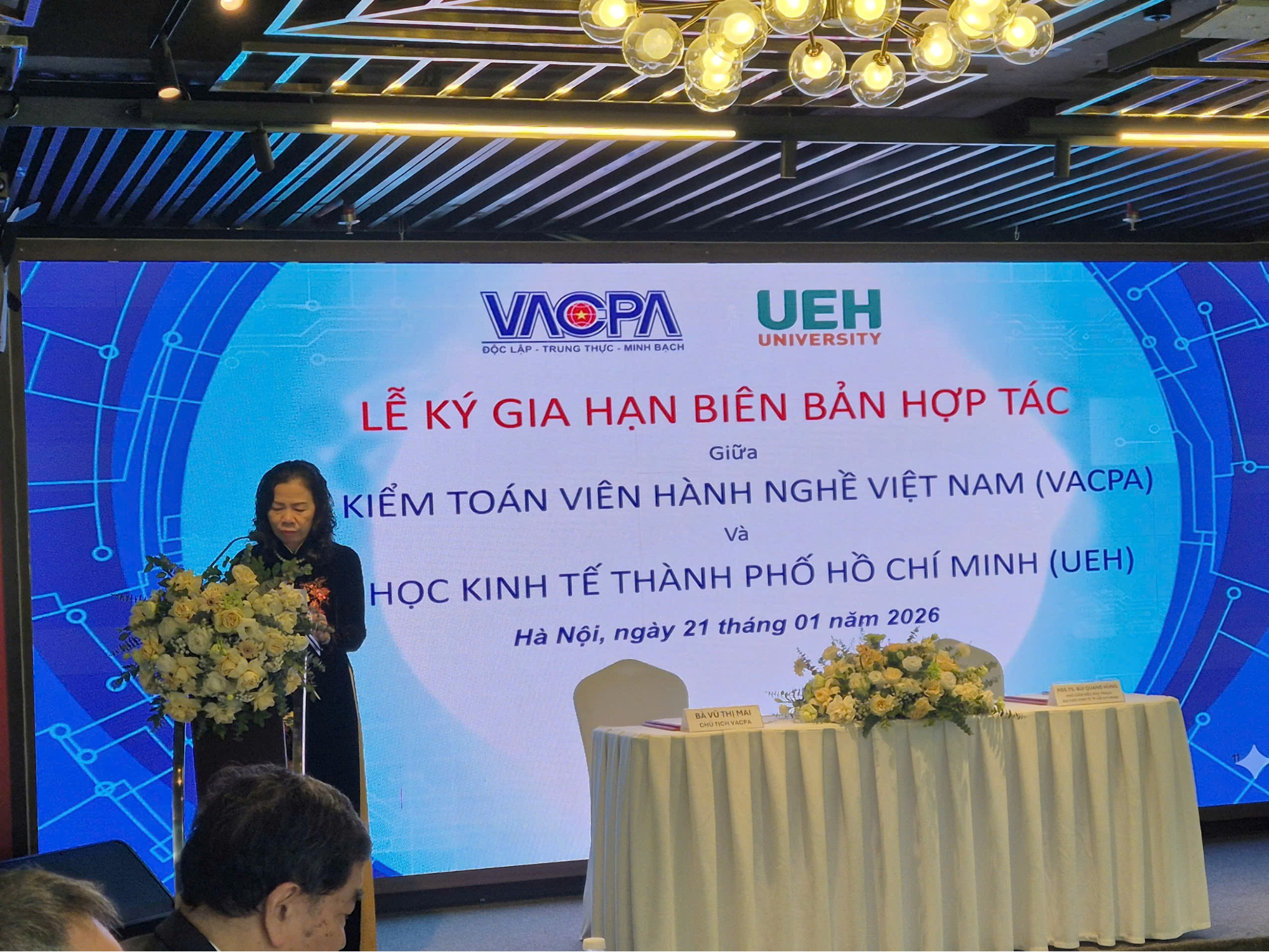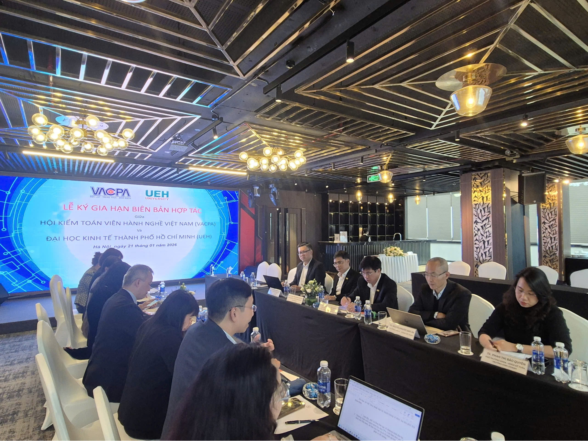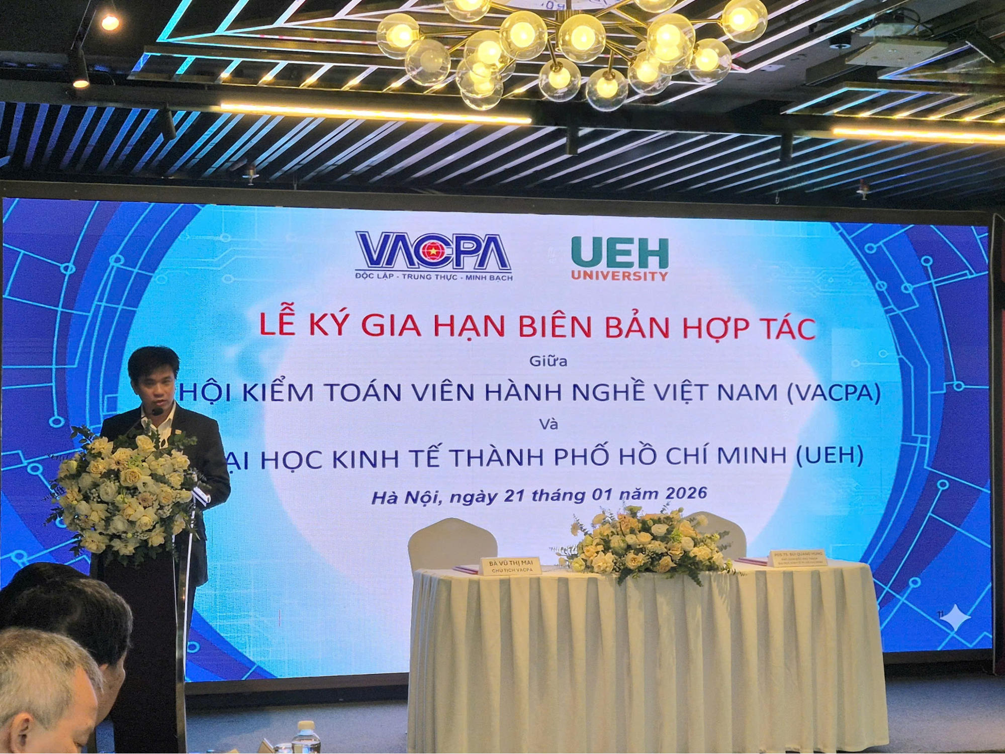 Sáng ngày 21/01/2026, Đại học Kinh tế Thành phố Hồ Chí Minh (UEH) và Hội Kiểm toán viên hành nghề Việt Nam (VACPA) đã ký gia hạn Biên bản ghi nhớ hợp tác (MOU), đồng thời chính thức ra mắt bản dịch sách “Chuẩn mực Giáo dục Quốc tế về Kế toán (IES). Sự kiện đánh dấu bước phát triển quan trọng trong mối quan hệ hợp tác giữa nhà trường và tổ chức nghề nghiệp uy tín trong lĩnh vực kế toán – kiểm toán, hướng đến mục tiêu nâng cao chất lượng đào tạo, nghiên cứu khoa học và gắn kết chặt chẽ giữa đào tạo và thực tiễn nghề nghiệp.