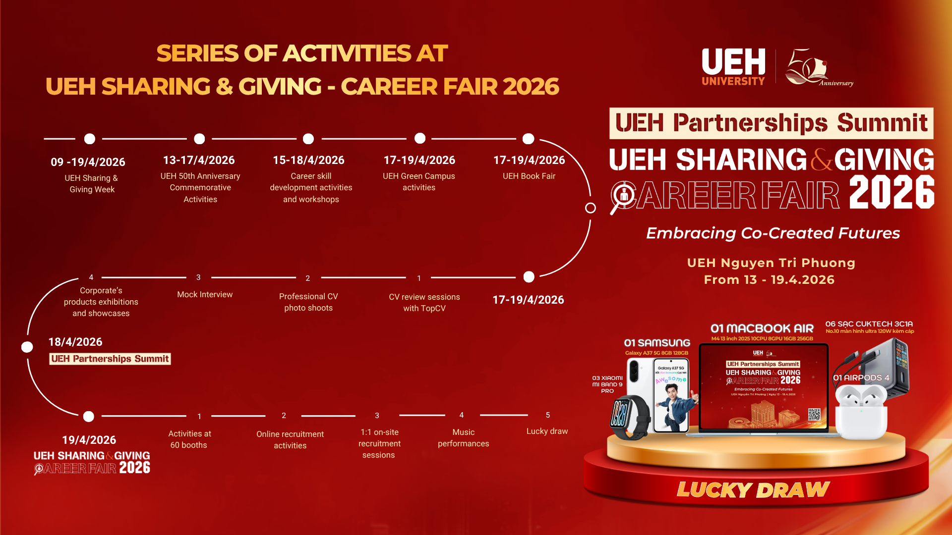 The UEH Sharing & Giving - Career Fair 2026 series will be held in person at the UEH campus (279 Nguyen Tri Phuong, Dien Hong Ward, Ho Chi Minh City) and online via event.ueh.edu.vn and vieclam.ueh.edu.vn from April 13 to April 19, 2026.