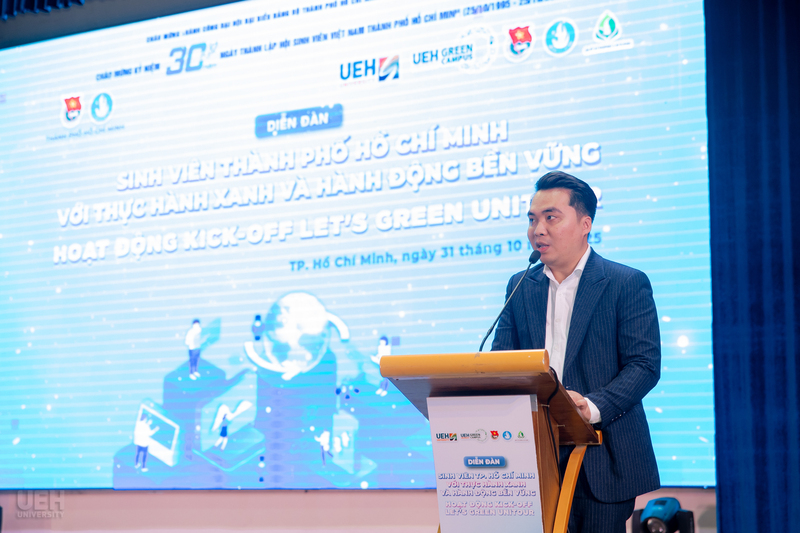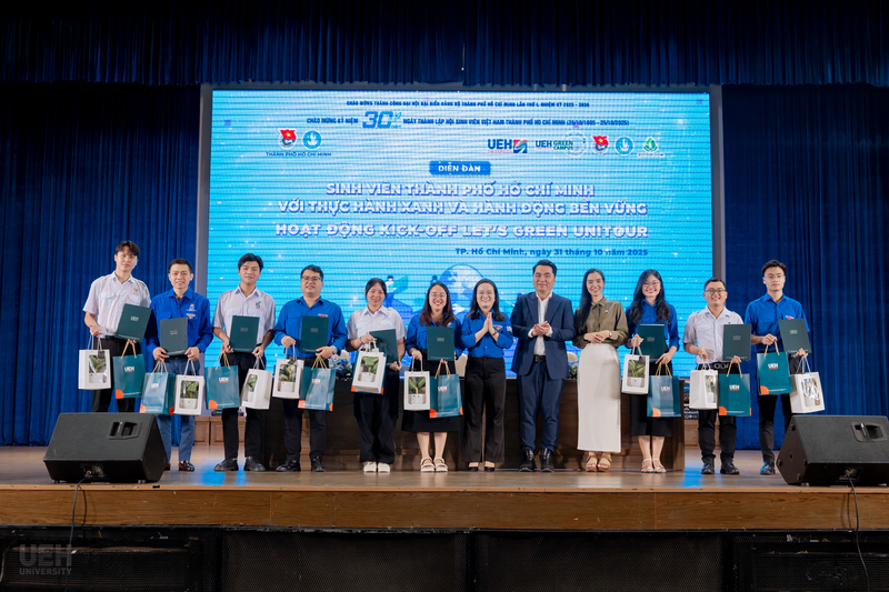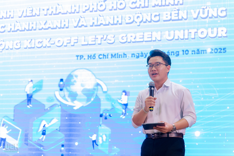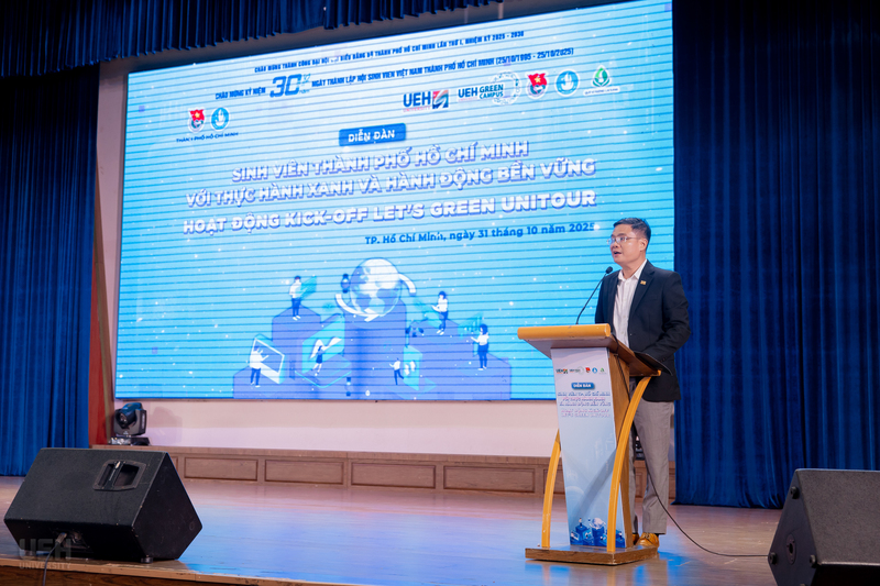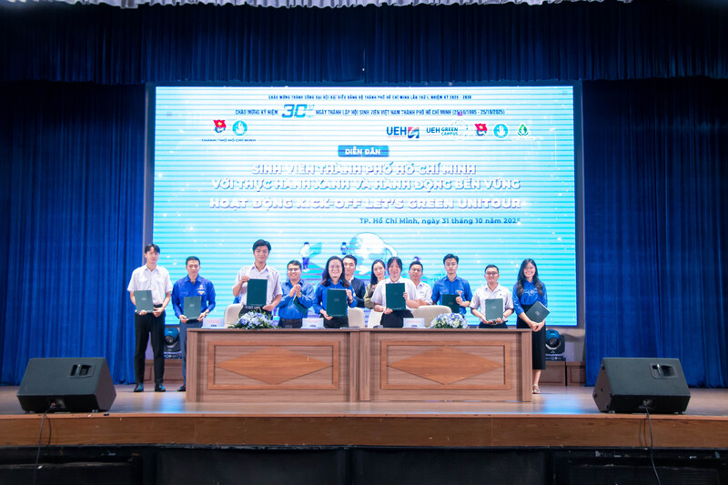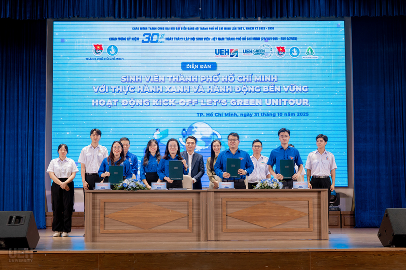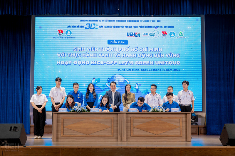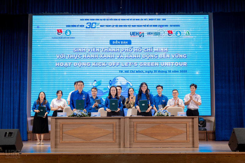 On the afternoon of October 31, 2025, in response to the "HCMC Student Week for Pioneering Development in Science, Technology, Innovation, and Digital Transformation 2025," the Ho Chi Minh Communist Youth Union and Vietnamese Students' Association of the University of Economics Ho Chi Minh City (UEH) collaborated with the UEH Green Campus project, with the partnership of VinGroup's Green Future Fund, to successfully organize the "Ho Chi Minh City Students with Green Practices and Sustainable Action" forum. The event also officially launched the Let's Green UniTour Project through a signing ceremony with 10 co-organizing units.