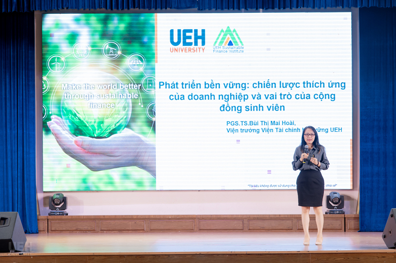 Following the opening, the forum featured two in-depth presentations from experts. Assoc. Prof. Dr. Bui Thi Mai Hoai - Dean of the UEH Sustainable Finance Institute, began with a presentation on “Sustainable Development: Adaptation Strategies and Challenges for Businesses.” She provided a comprehensive overview of current environmental issues, emphasized the importance of global sustainable development, and called upon the younger generation to take practical action in the face of environmental challenges.