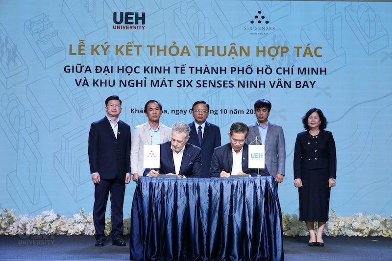 Signing ceremony of Memoranda of Understanding (MOUs) between UEH and strategic partners in Khanh Hoa, with the participation of Amanoi Resort, Six Senses Ninh Van Bay, Vietcombank Khanh Hoa, and Khanh Hoa Newspaper and Radio – Television