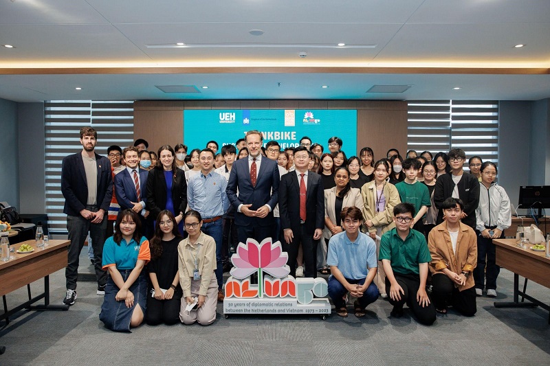 During the anniversary week of the 50th year of diplomatic relations between Vietnam and the Netherlands, on April 5th, 2023, the University of Economics Ho Chi Minh City (UEH) co-organized the international workshop “ThinkBike - Sustainable Development” with the Consulate of the Kingdom of the Netherlands and the Dutch Cycling Embassy (DCE). The event welcomed nearly 90 students from UEH and other universities in robust and lively conversations on sustainable living and best cycling practices.