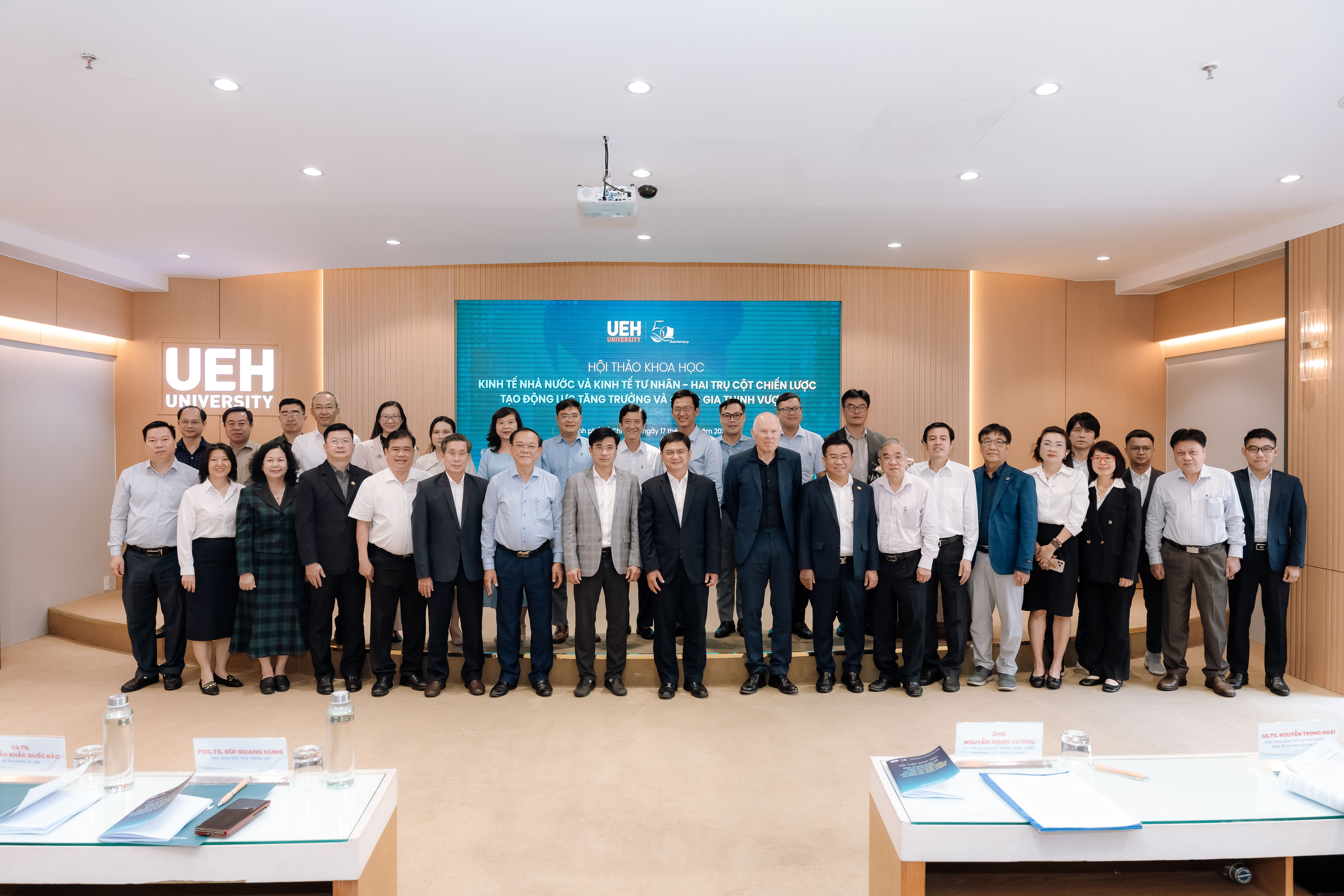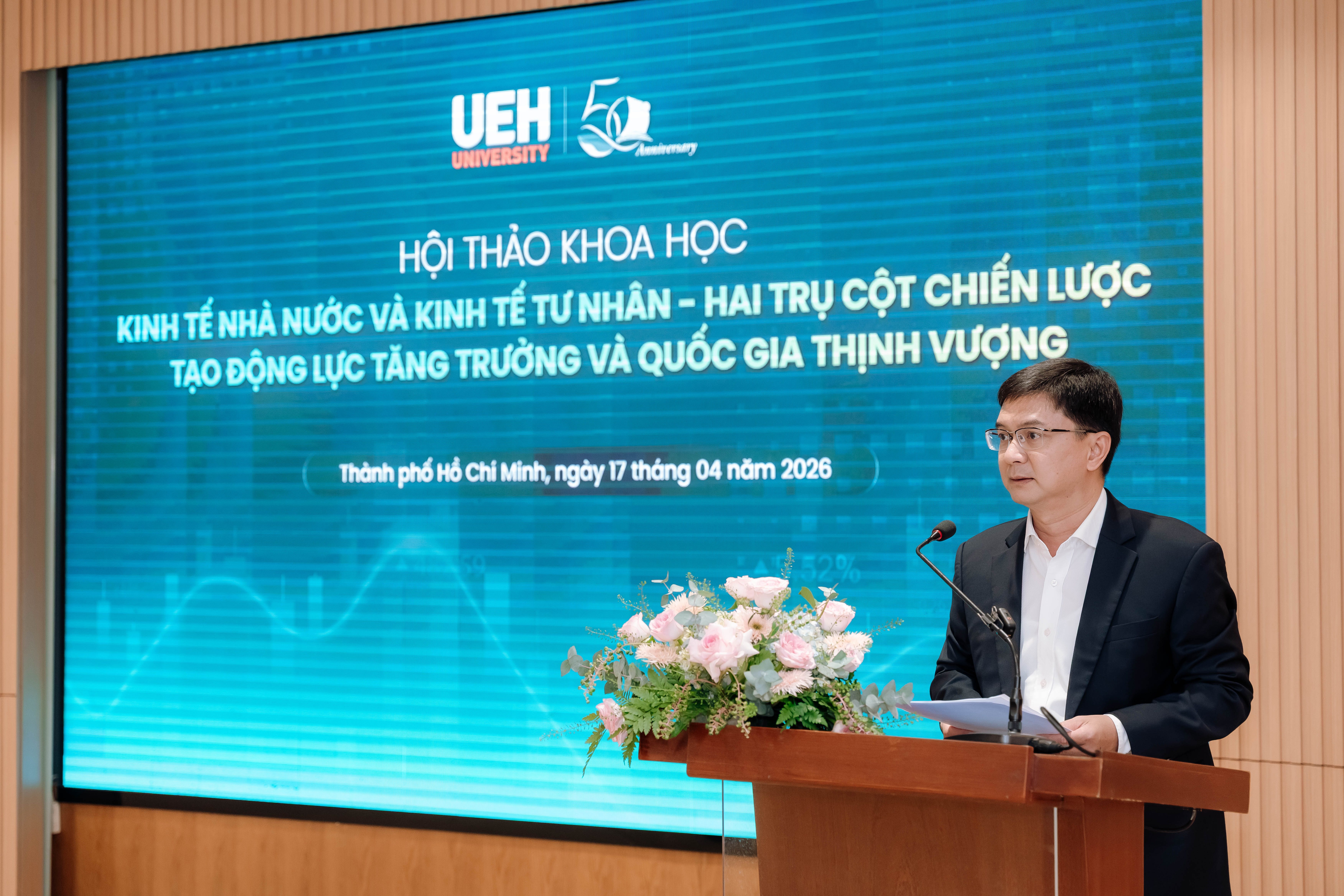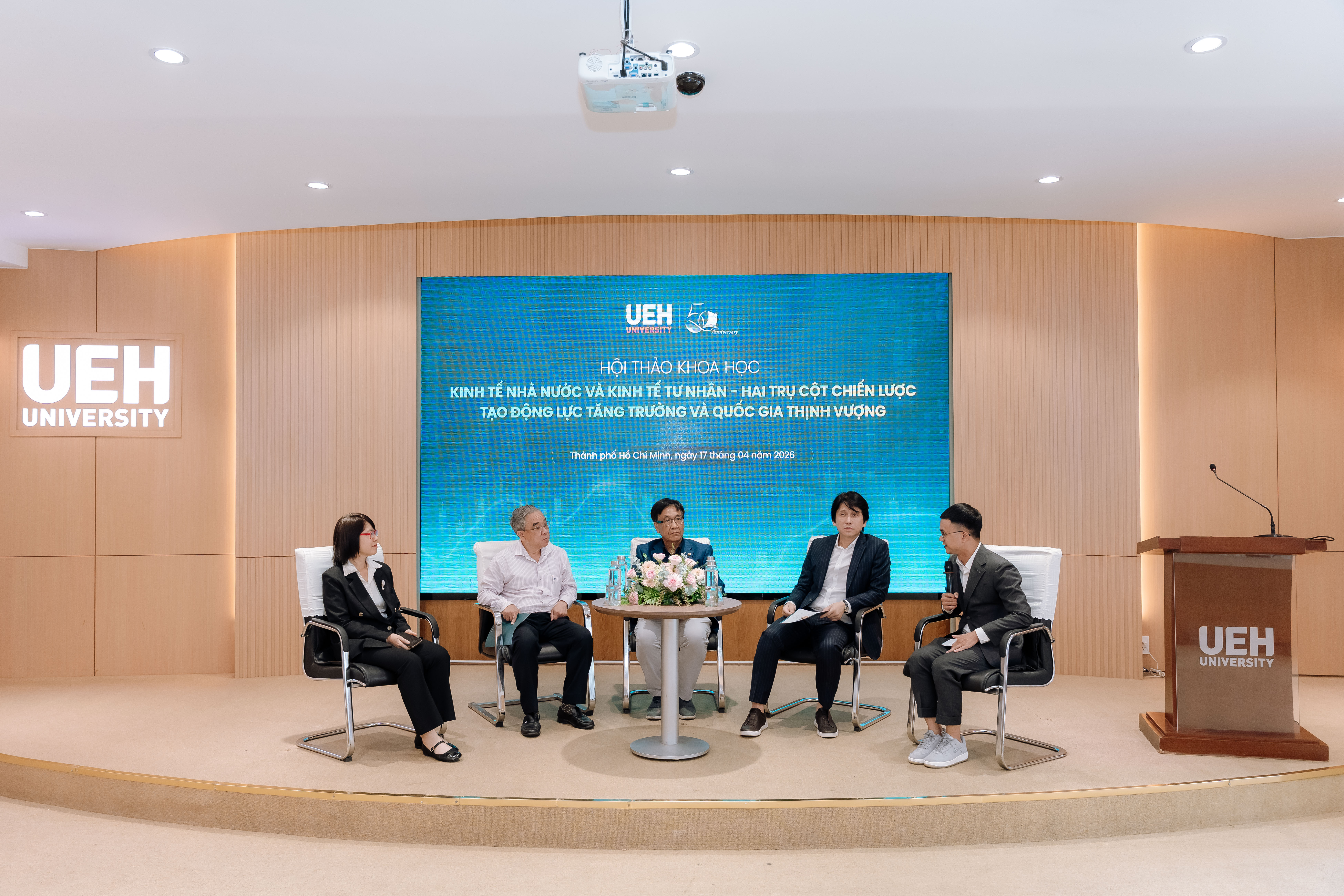 Sáng ngày 17/04/2026, Đại học Kinh tế Thành phố Hồ Chí Minh (UEH) đã tổ chức hội thảo khoa học “Kinh tế nhà nước và kinh tế tư nhân - Hai trụ cột chiến lược tạo động lực tăng trưởng và quốc gia thịnh vượng”, với sự tham gia của lãnh đạo TP.HCM, các chuyên gia, nhà khoa học và đại diện doanh nghiệp. Hội thảo là diễn đàn trao đổi học thuật và thực tiễn, tập trung làm rõ vai trò của hai khu vực kinh tế và thúc đẩy đối thoại về các định hướng chính sách trong giai đoạn phát triển mới.