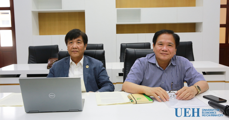 PGS.TS. Nguyễn Thế Chinh - Viện trưởng Viện Chiến lược & Chính sách, Bộ Tài nguyên và Môi trường; GS.TS. Nguyễn Trọng Hoài - Phó Hiệu trưởng UEH chủ trì buổi làm việc