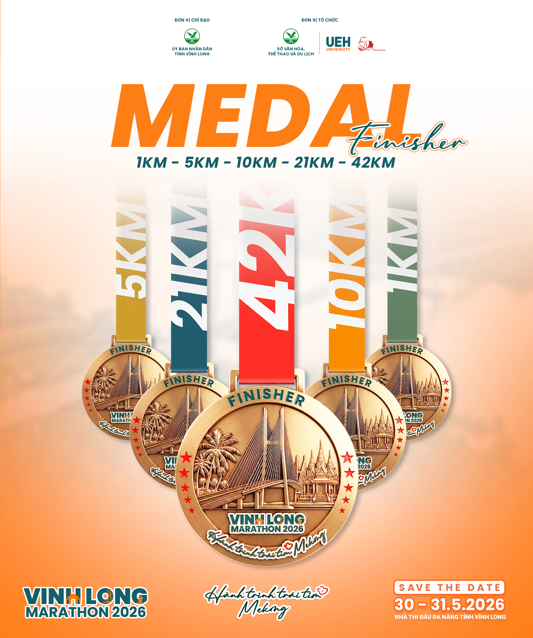 - Huy chương Finisher Vĩnh Long Marathon 2026: Được ví “linh hồn” của giải đấu, kết tinh trọn vẹn nghĩa tình miền Tây sông nước. Thiết kế là sự giao hòa tinh tế giữa hình ảnh rặng dừa xanh, mái chùa Khmer cổ kính và cầu Mỹ Thuận vững chãi, tạo nên biểu trưng kết nối giữa truyền thống và hiện đại, giữa ký ức và niềm tự hào của vùng đất Vĩnh Long.