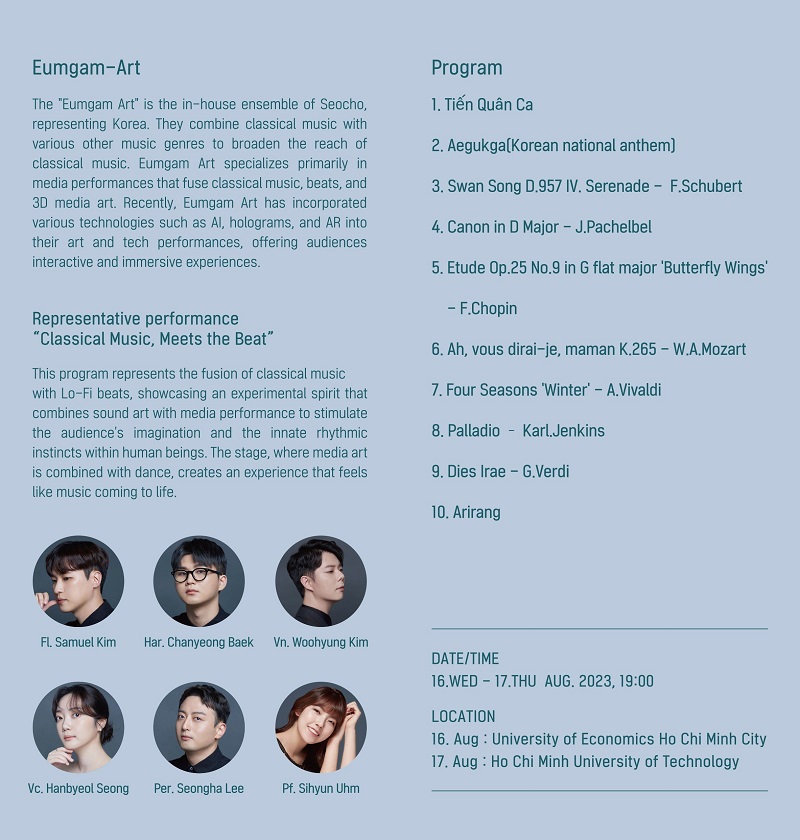 Chương trình sẽ mang đến một không gian kết nối giữa cảm xúc và con người bằng chất liệu âm nhạc cổ điển kết hợp với hiện đại do chính những nghệ sĩ trẻ xuất sắc của Hàn Quốc biểu diễn. Đây cũng chính là hoạt động tiền đề của một “Cộng đồng truyền cảm hứng nghệ thuật và phát triển bền vững” trong chiến lược Đại học Đa ngành và Bền vững của UEH.