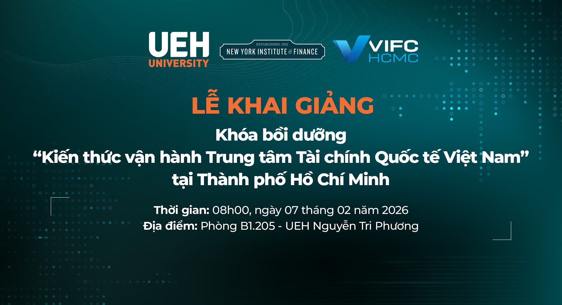 Sáng ngày 07/02/2026, Đại học Kinh tế Thành phố Hồ Chí Minh (UEH) sẽ tổ chức Lễ khai giảng khóa bồi dưỡng Kiến thức vận hành Trung tâm Tài chính Quốc tế Việt Nam tại Thành phố Hồ Chí Minh. Chương trình được triển khai nhằm chuẩn bị nguồn nhân lực cho giai đoạn hình thành và vận hành Trung tâm Tài chính Quốc tế (IFC), góp phần đáp ứng nhu cầu cấp thiết về đội ngũ nhân sự chuyên nghiệp, chuẩn mực và hội nhập quốc tế.
