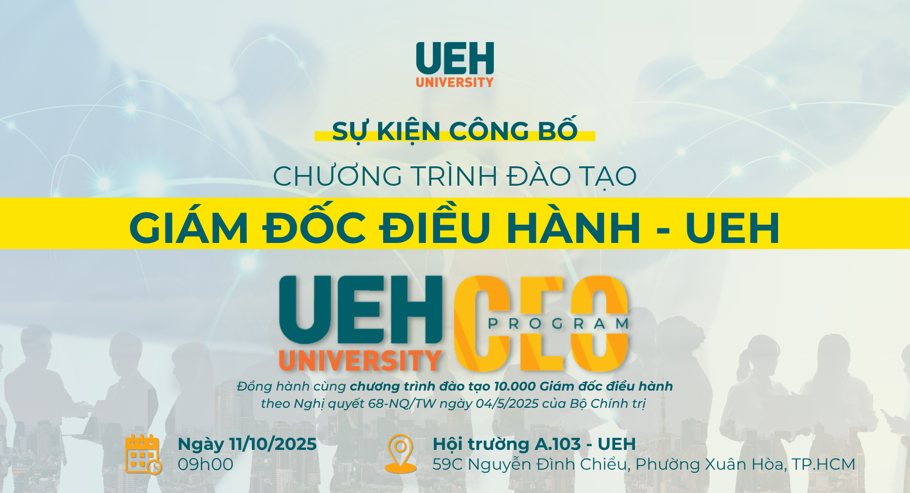 Đại học Kinh tế Thành phố Hồ Chí Minh (UEH) phối hợp cùng đội ngũ giảng viên, chuyên gia trong nước và quốc tế chính thức triển khai Chương trình Giám đốc điều hành - UEH (UEH CEO Program) góp phần nâng cao năng lực cạnh tranh của khu vực kinh tế tư nhân và hiện thực hóa Nghị quyết 68-NQ/TW của Bộ Chính trị về phát triển kinh tế tư nhân.