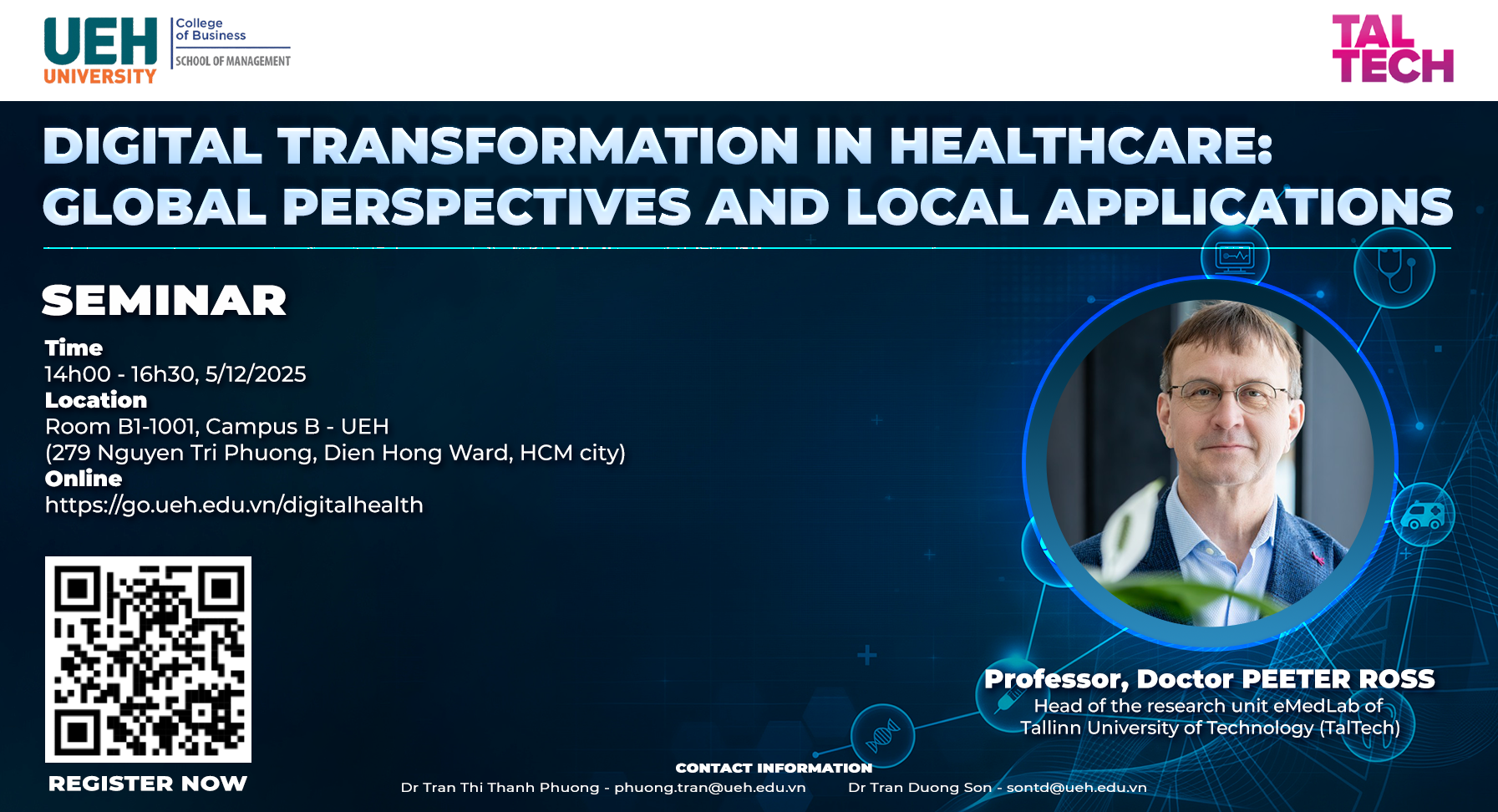Nhằm tạo không gian trao đổi học thuật về xu hướng chuyển đổi số trong lĩnh vực y tế và chia sẻ kinh nghiệm quốc tế gắn với bối cảnh Việt Nam, Khoa Quản trị, Trường Kinh doanh - Đại học Kinh tế Thành phố Hồ Chí Minh (UEH) sẽ tổ chức buổi tọa đàm chuyên đề theo hình thức Hybrid với chủ đề: “Digital Transformation in Healthcare: Global Perspectives and Local Applications”.