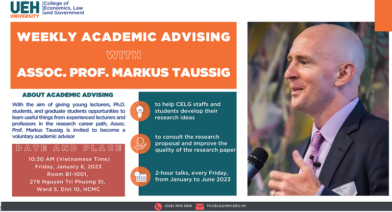 To make an appointment with a voluntary academic advisor, please fill out this form: https://go.ueh.edu.vn/MarkusTaussigappointment or contact CELG Administration Office via email: th.celg@ueh.edu.vn.