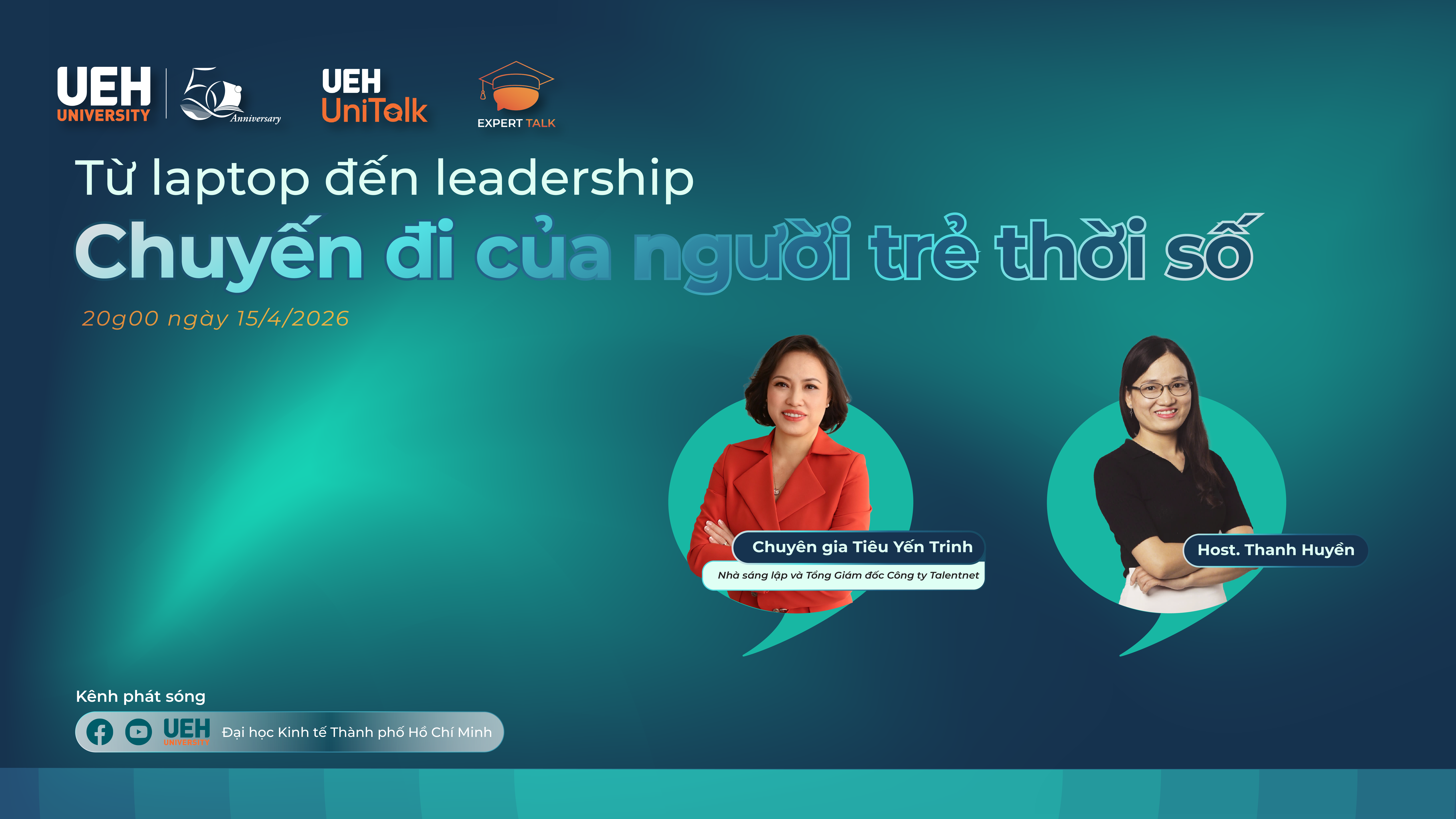 Cùng lắng nghe những giải đáp từ Chuyên gia Tiêu Yến Trinh – Đồng sáng lập & Tổng Giám đốc Talentnet về chủ đề “Từ laptop đến leadership: Chuyến đi của người trẻ thời số” tại Expert Talk tập 6. Live talk được phát sóng trên hệ thống kênh YouTube UEH Channel: https://go.ueh.edu.vn/ExpertTalk. Với những nội dung hấp dẫn: