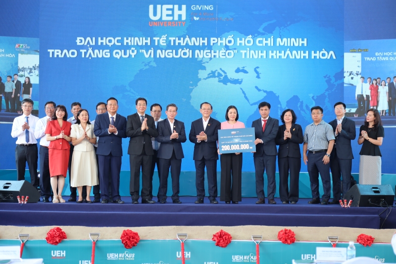 Cũng ngay giây phút này, UEH đã trao tặng 200 triệu đồng cho Quỹ “Vì người nghèo” tỉnh Khánh Hòa, thể hiện cam kết chia sẻ trách nhiệm xã hội và hỗ trợ cộng đồng, góp phần xây dựng một xã hội công bằng và phát triển bền vững.