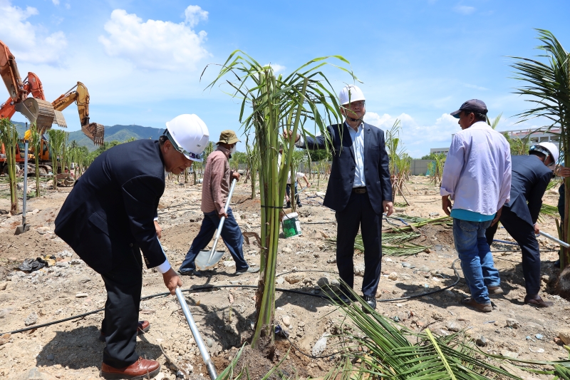 Quý đại biểu, lãnh đạo, đối tác quốc tế và doanh nghiệp cùng nhau trồng cây tại UEH Nexus Campus Nha Trang thể hiện cam kết xây dựng và phát triển một tương lai xanh bền vững cho Khánh Hòa