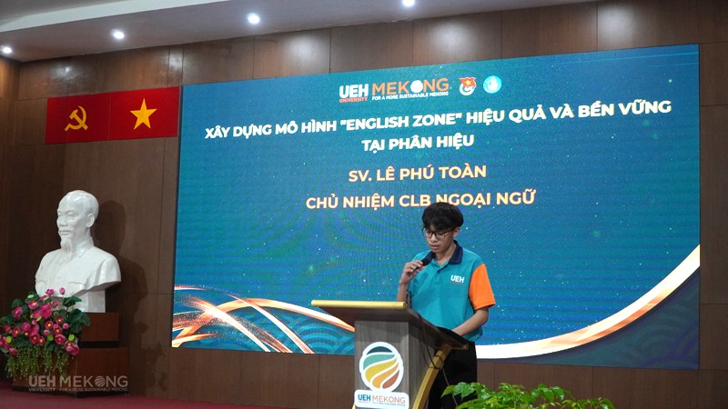 Tại buổi đối thoại, SV. Lê Phú Toàn - Chủ nhiệm CLB Ngoại ngữ đã trình bày tham luận về xây dựng mô hình “English Zone” như một giải pháp tạo môi trường sử dụng tiếng Anh thực tế cho sinh viên. Tham luận đề xuất việc thu hẹp khoảng cách giữa học và sử dụng ngôn ngữ thông qua các hoạt động tương tác như speaking group, workshop và trải nghiệm thực tiễn, góp phần nâng cao sự tự tin, phản xạ ngôn ngữ và khả năng hội nhập quốc tế cho sinh viên UEH Mekong.