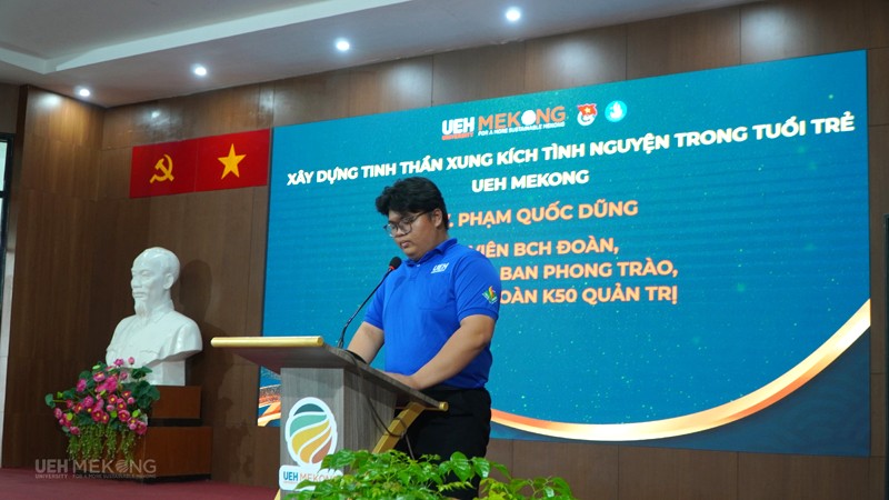 Sinh viên Phạm Quốc Dũng - Thành viên Ban Phong trào - Tình nguyện - Hỗ trợ sinh viên, Bí thư Chi đoàn K50 Quản trị trình bày tham luận về “Xây dựng tinh thần xung kích tình nguyện trong tuổi trẻ UEH Mekong”