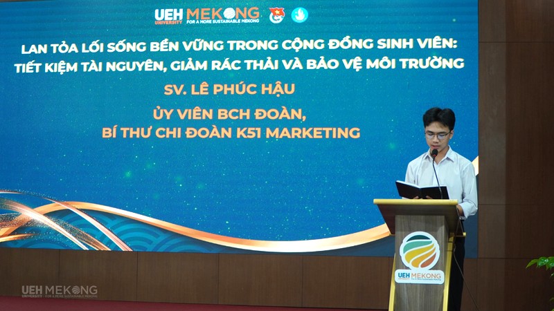 Bên cạnh đó, SV. Lê Phúc Hậu đã mang đến tham luận về lan tỏa lối sống bền vững trong cộng đồng sinh viên. Nội dung tập trung vào việc nâng cao nhận thức và thúc đẩy hành động sống xanh thông qua các hoạt động cụ thể như phân loại rác, tiết kiệm tài nguyên, tham gia tình nguyện và nghiên cứu khoa học, đồng thời đề xuất các giải pháp nhằm lan tỏa mạnh mẽ hơn lối sống bền vững tại UEH Mekong.