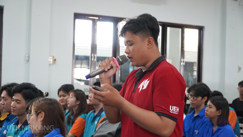 Tiếp nối chương trình, SV. Phạm Quốc Dũng đã chia sẻ tham luận về việc lan tỏa tinh thần xung kích tình nguyện trong sinh viên UEH Mekong. Nội dung tham luận khẳng định vai trò của hoạt động tình nguyện trong việc hình thành trách nhiệm xã hội, đồng thời đề xuất các giải pháp như đa dạng hóa mô hình tình nguyện, chuyên nghiệp hóa tổ chức hoạt động và tăng cường ghi nhận, nhằm thúc đẩy sự tham gia rộng rãi và bền vững của sinh viên.