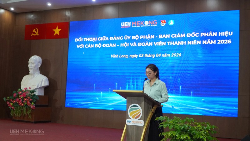 Ngày 01/4/2026, Ban Chấp hành Đoàn - Hội UEH Mekong đã tổ chức chương trình đối thoại giữa Đảng ủy bộ phận, Ban Giám đốc UEH Mekong với cán bộ Đoàn - Hội và đoàn viên thanh niên năm 2026 tại Hội trường A. Chương trình được tổ chức nhằm mục đích lắng nghe những ý kiến, nguyện vọng, đề xuất của cán bộ Đoàn - Hội, đoàn viên thanh niên để Đảng ủy bộ phận, Ban Giám đốc UEH Mekong cùng BCH Đoàn - Hội có những giải pháp hỗ trợ kịp thời, góp phần nâng cao chất lượng công tác Đoàn - Hội và công tác sinh viên tại UEH Mekong.