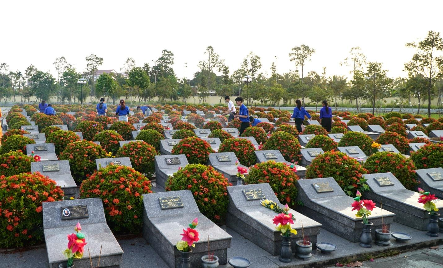 Đoàn viên thanh niên UEH Mekong tham gia dọn dẹp vệ sinh tại Nghĩa trang liệt sĩ tỉnh Vĩnh Long
