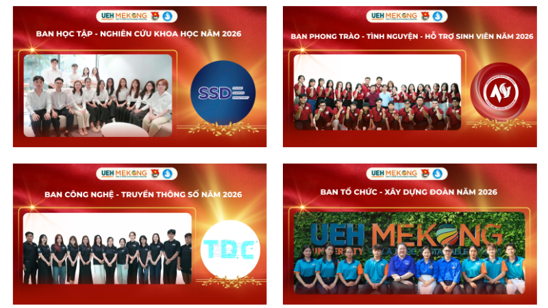Hiện tại BCH Đoàn UEH Mekong có 04 Ban chuyên môn, gồm: Ban Phong trào - Tình nguyện - Hỗ trợ Sinh viên; Ban Học tập- Nghiên cứu khoa học; Ban Tổ chức - Xây dựng Đoàn; Ban Công nghệ - Truyền thông số. Trong năm 2025, các Ban chuyên môn đã không ngừng nỗ lực triển khai nhiều hoạt động học thuật và phong trào, góp phần hỗ trợ sinh viên nâng cao kiến thức chuyên môn và rèn luyện kỹ năng. Bước sang năm 2026, các Ban đã tiến hành kiện toàn nhân sự, lựa chọn và bổ sung những gương mặt mới nhằm tiếp tục nâng cao hiệu quả hoạt động. Hi vọng với lực lượng được củng cố, các Ban chuyên môn sẽ phát huy tốt năng lực, tổ chức nhiều hoạt động sáng tạo, thiết thực và chất lượng hơn trong thời gian tới.
